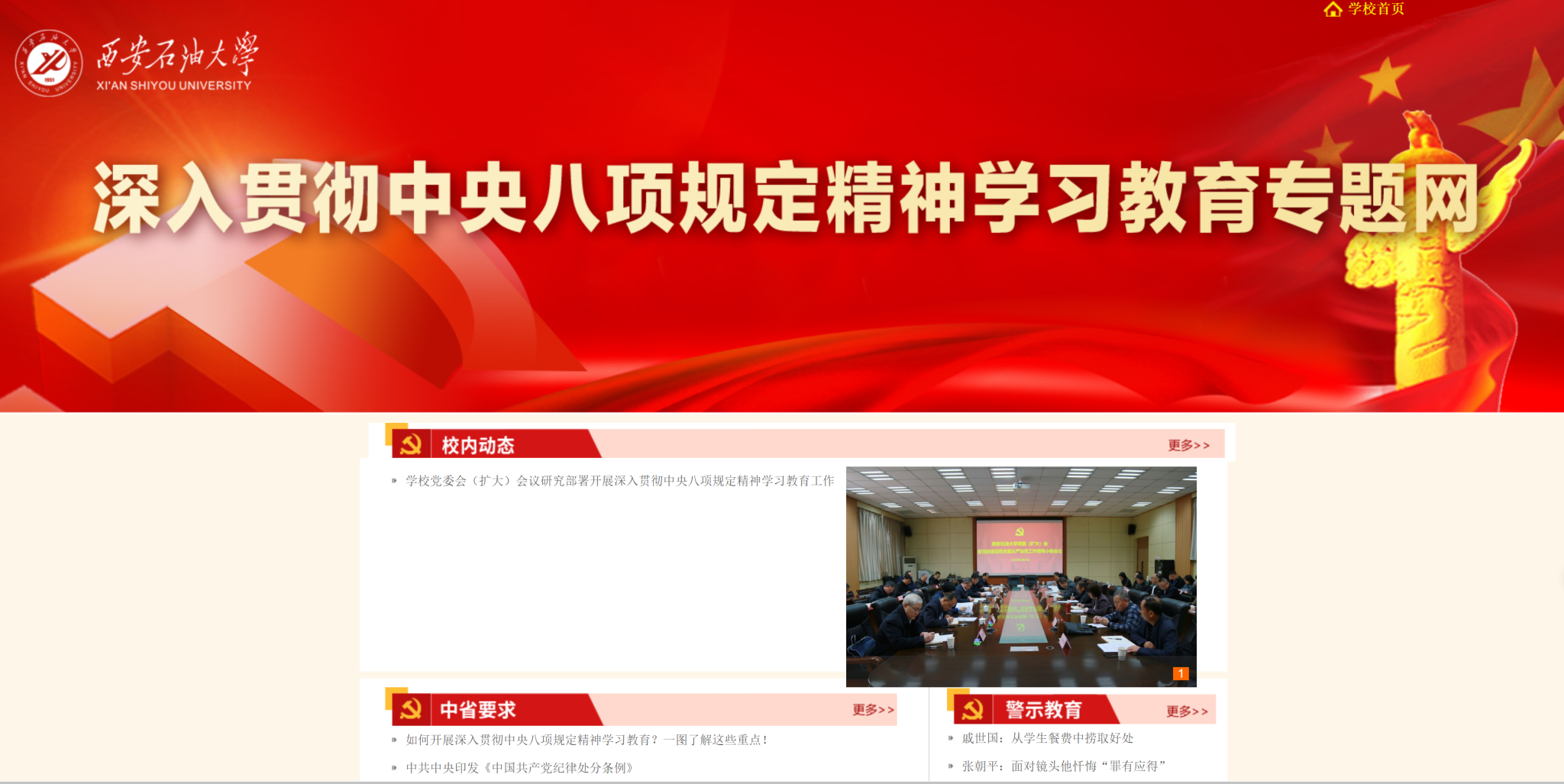 網站設置了“校內動態”“中省要求”“理論學習”“警示教育”四個欄目。“校內動態”報道我校及各部門、各院系開展學習教育活動的動態新聞;“中省要求”傳達中央、陜西省開展深入貫徹中央八項規定精神學習教育的部署要求;“理論學習”轉載權威專家對中央八項規定精神的解讀文章,以及主流媒體關于學習教育活動的言論評述;“警示教育”主要展示違反中央八項規定精神的典型案例、深度剖析。