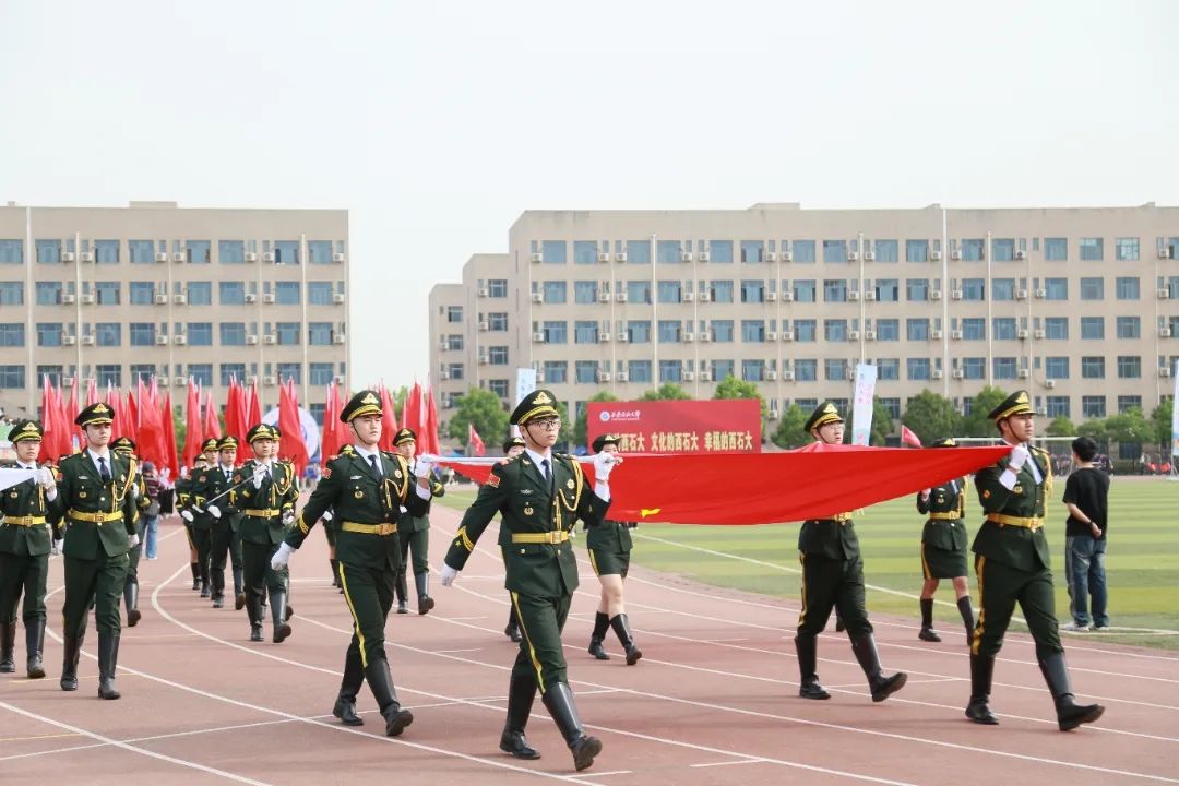 入場儀式完畢,全場起立。升中華人民共和國國旗、西安石油大學校旗、運動會會旗,全場師生齊唱國歌、校歌。