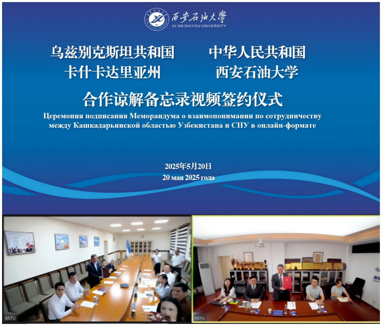 5月20日上午,學校與烏茲別克斯坦卡什卡達里亞州合作諒解備忘錄視頻簽約儀式在雁塔校區東方石油樓801舉行。烏茲別克斯坦卡什卡達里亞州副州長安爾瓦?卡比洛夫,卡爾希國立技術大學副校長烏扎科夫·古洛姆·諾爾博耶維奇,我校校長王進富、副校長張榮軍出席簽約儀式。