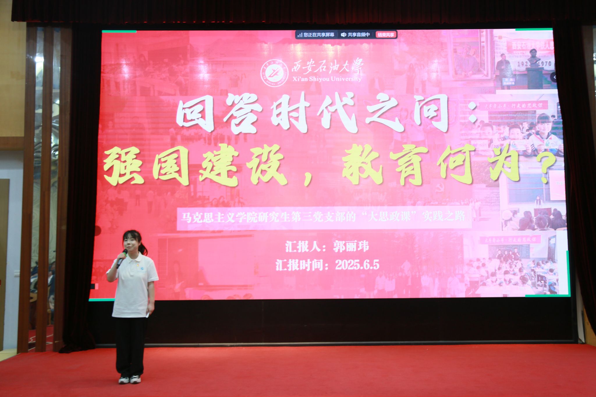 在十佳研究生黨員風采展示中,石油工程學院博士研究生陳浩宇講述了以“融山匯海”之志踐行能源報國初心,將九年志愿服務與六年黨務工作融入科研探索,發表8篇SCI論文和多項科研項目,以1150小時志愿服務踐行初心,以山海之志鑄就能源報國的新篇。經濟管理學院碩士研究生姬祥飛講述了在西石大七年求學中,勤于實踐,漫漫求索,獲學生骨干、學術科研、學科競賽等多項成果,曾獲三次國家獎學金,榮獲“陜西好青年”,彰顯新時代青年擔當的故事。機械工程學院碩士研究生李紀新,以“紀實青春支教路,心繪未來新篇章”為主題分享了他的支教經歷和感悟,展現了以青春之小我融入祖國之大我,在未來學術挑戰中奮勇向前的信心和決心。電子工程學院碩士研究生熊澤康以“小電路大擔當:一名工科黨員的能源報國路”為題,講述了以紅色信仰鑄就科研報國志,在團隊科研項目中實現國產化突破,抒發了石油學子以電路為刃破解能源困局,以青春擔當鑄牢國家能源安全防線的青春志向。