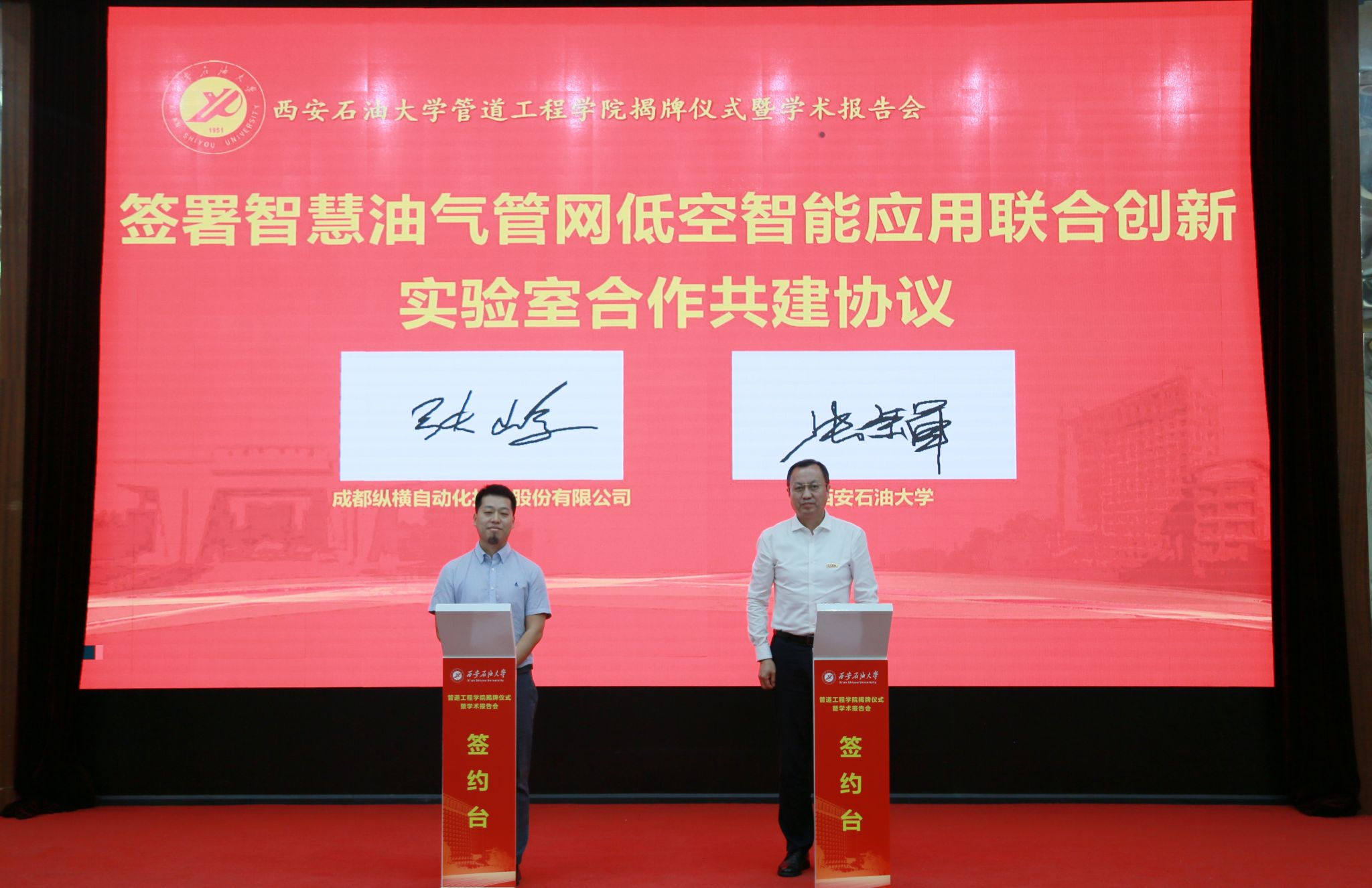 副校長張榮軍與成都縱橫自動化技術股份有限公司副總經理張峻代表校企雙方簽署“智慧油氣管網低空智能應用聯合創新實驗室”合作共建協議。