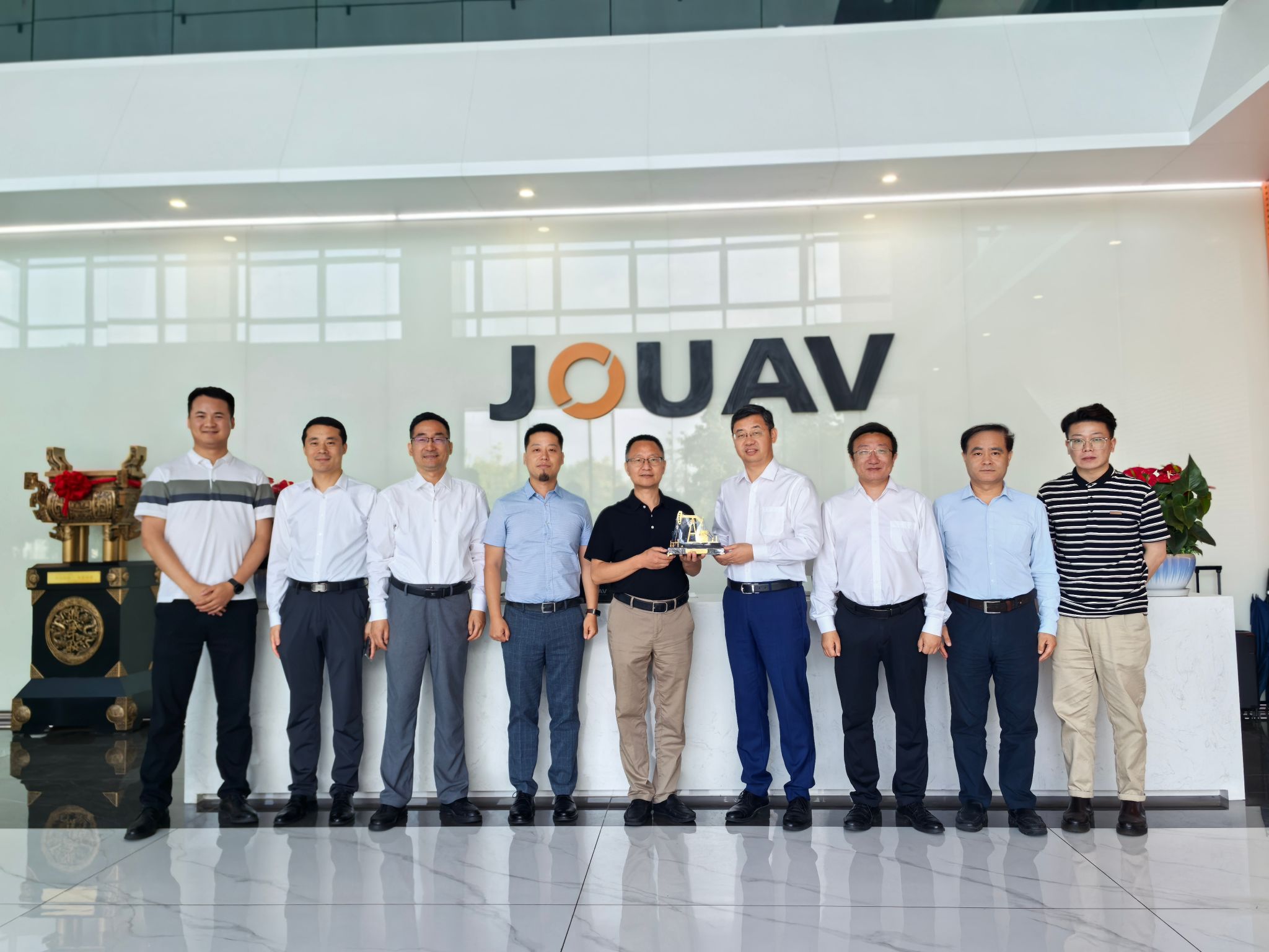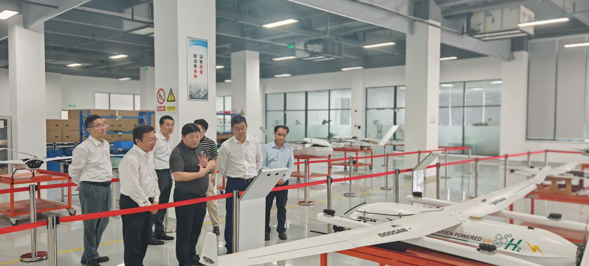 會前,在張峻陪同和講解下,王進富一行參觀了公司展廳,無人機生產線、機庫指揮中心等,直觀感受了企業的先進技術和生產實力。