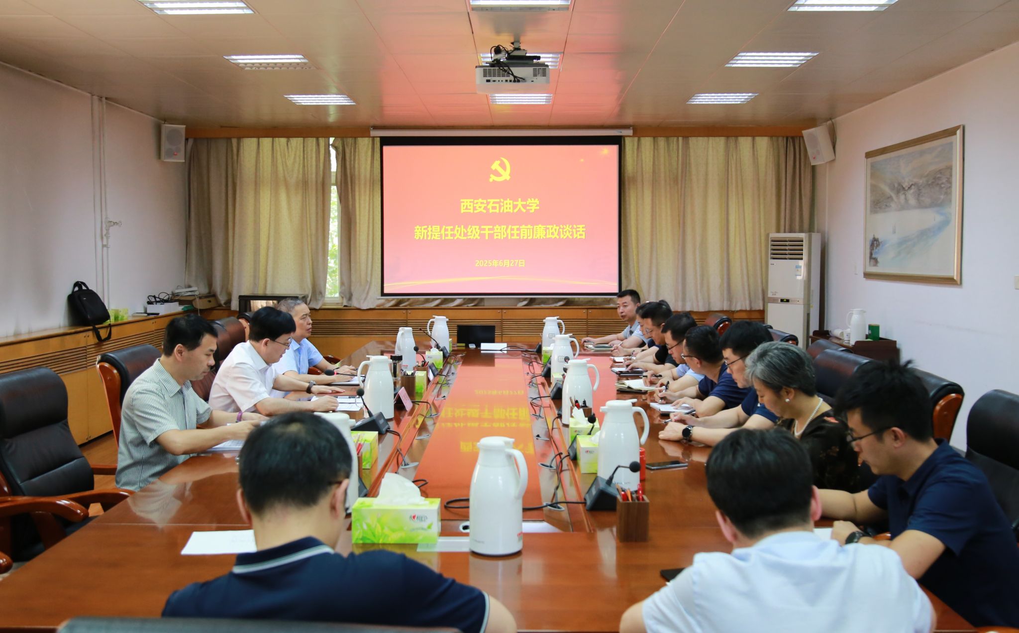 6月27日下午,校紀委在雁塔校區辦公樓五樓會議室召開干部廉政談話會,校黨委副書記、紀委書記、監察專員王輝強與新提任處級干部開展集體廉政談話。新提任的處級干部和校紀委相關負責人參加會議。