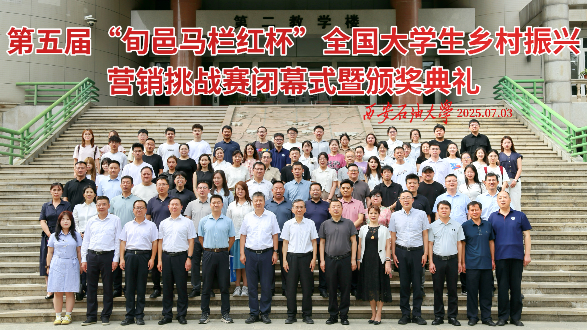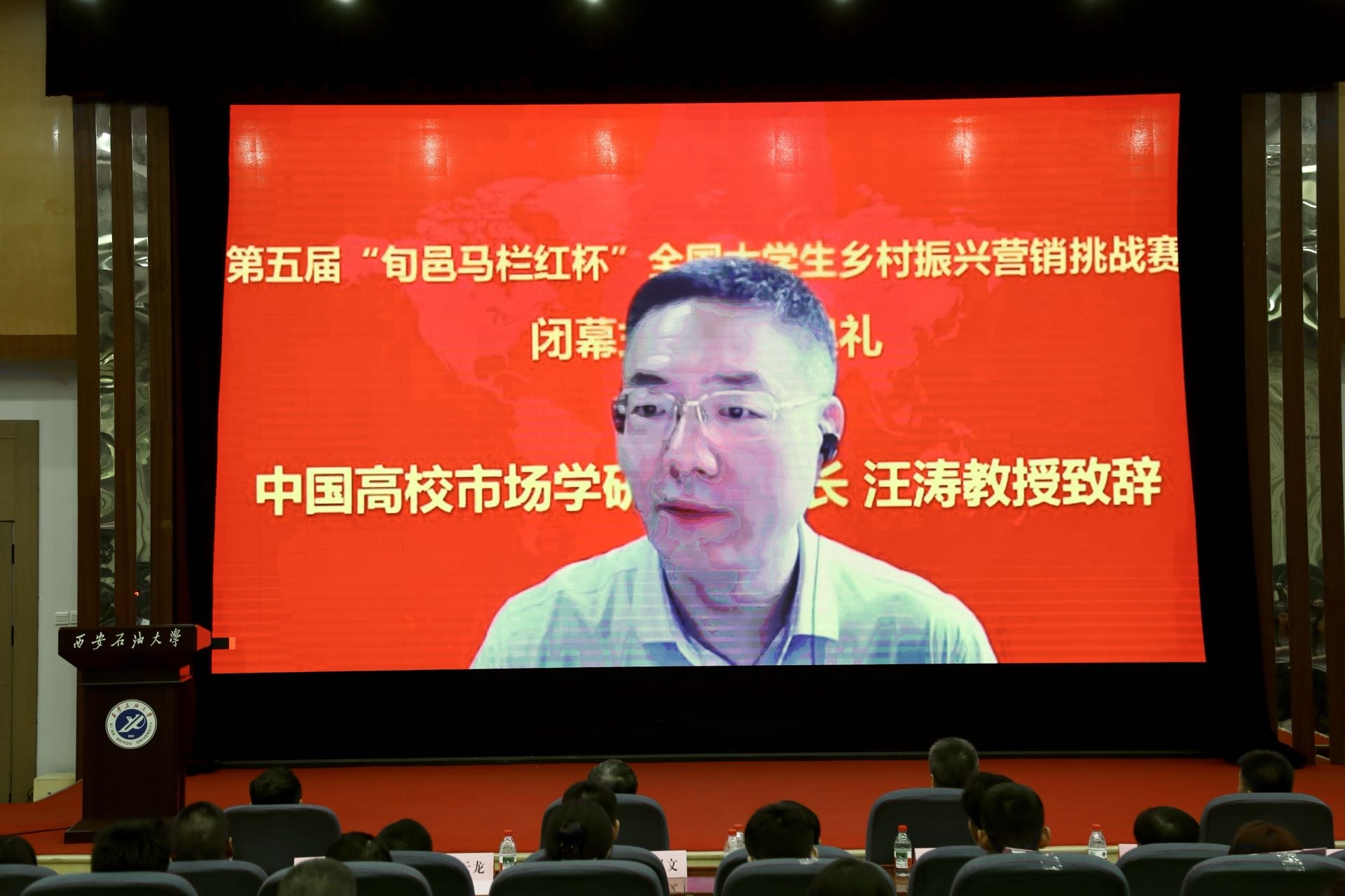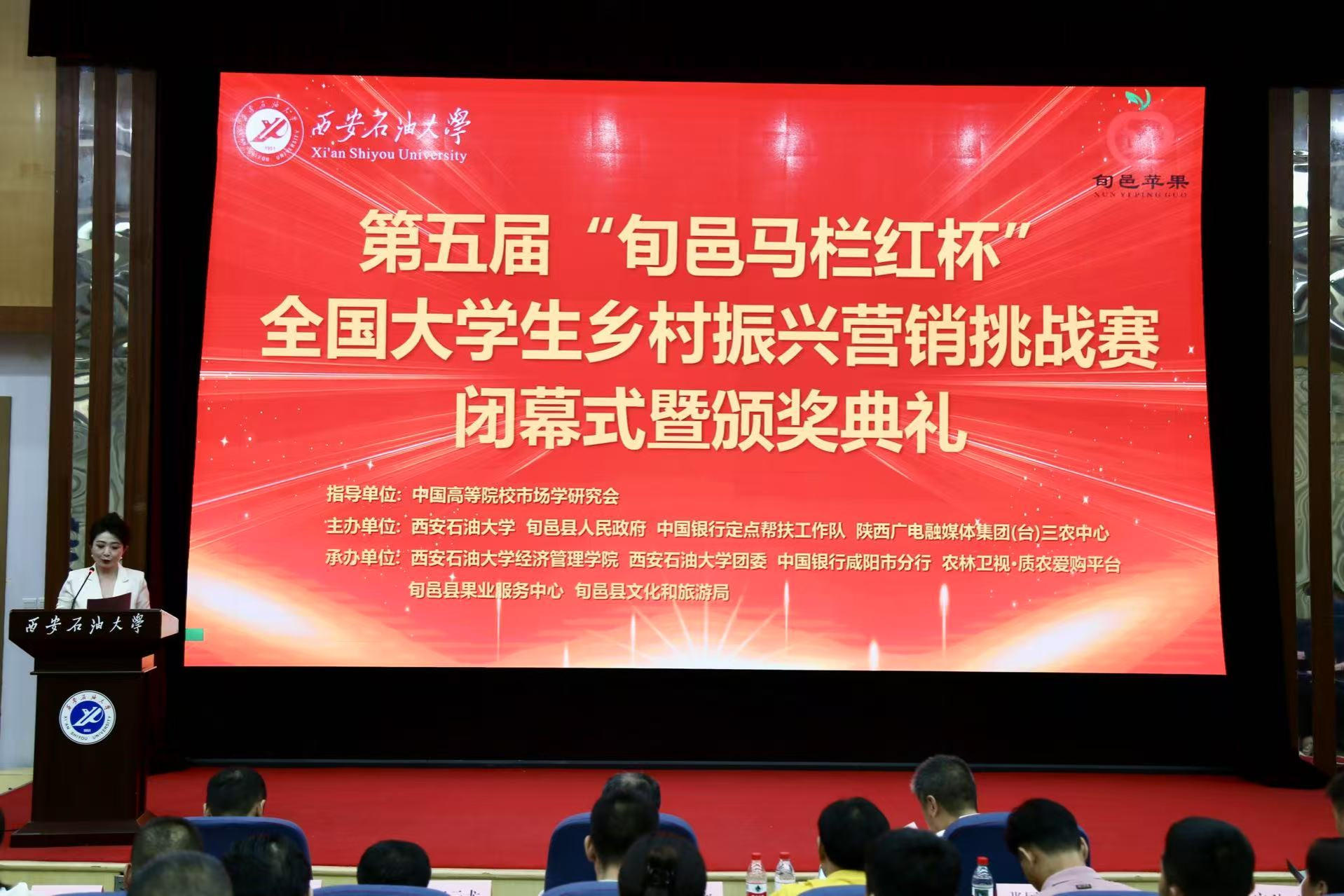 7月3日,第五屆“旬邑馬欄紅杯”全國大學生鄉村振興營銷挑戰賽閉幕式暨頒獎典禮在西安石油大學雁塔校區會議中心順利舉行。本屆賽事由西安石油大學、旬邑縣人民政府、陜西廣電融媒體集團三農中心等單位共同主辦,中國高等院校市場學研究會為指導單位。咸陽市副市長葉新階、副秘書長何有明、農業農村局副局長袁野,陜西省果業中心綜合處處長張東峰,旬邑縣委副書記、縣長陳永勝、副縣長譚震,陜西廣電融媒體集團質農愛購平臺總經理趙小飛,中國銀行咸陽分行行政事業部主任朱燕萍、陜西日報群眾新聞網副總經理劉強,西安石油大學黨委副書記張木等出席閉幕式。參賽團隊、企業負責人百余人到場參會。