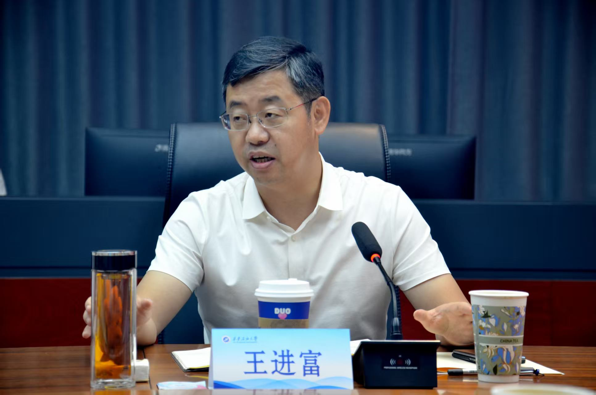 慰問結束后,王進富與15名本科生、研究生代表以“讀萬卷書 行萬里路—從研途到世界”為主題開展座談交流。他在認真聽取同學們對學校發展的意見建議和自我學習成長的感悟后,從改善學習條件、改革教學模式、拓寬國際化視野、體驗文化差異等四個方面對同學們提出的問題作了回應。同時,王進富結合自身求學工作經歷鼓勵同學們:一是使閱讀成為終身習慣。他指出,真正的讀書不僅是知識的積累,更是一場與自我的對話,建議同學們通過深度閱讀建立自己的知識體系,始終保持對知識的好奇與渴望,既要深耕專業領域,也要廣泛涉獵不同學科,在經典著作中汲取智慧,在多元閱讀中培養獨立思考能力,讓書香伴隨成長。二是在實踐中豐富人生體驗。他建議同學們既要讀“有字之書”,也要讀“無字之書”,鼓勵同學們走出校園,在更廣闊的天地中學習,無論是參與鄉村調研、企業實習,還是赴海外交流,這些經歷都能讓人突破認知局限,理解世界的豐富性與多樣性。三是用開放心態擁抱廣闊天地。他希望同學們培養全球視野,既要立足本土文化,又要理解世界多樣性,在跨文化交流中提升格局,成為兼具文化底蘊和國際視野的新時代人才。