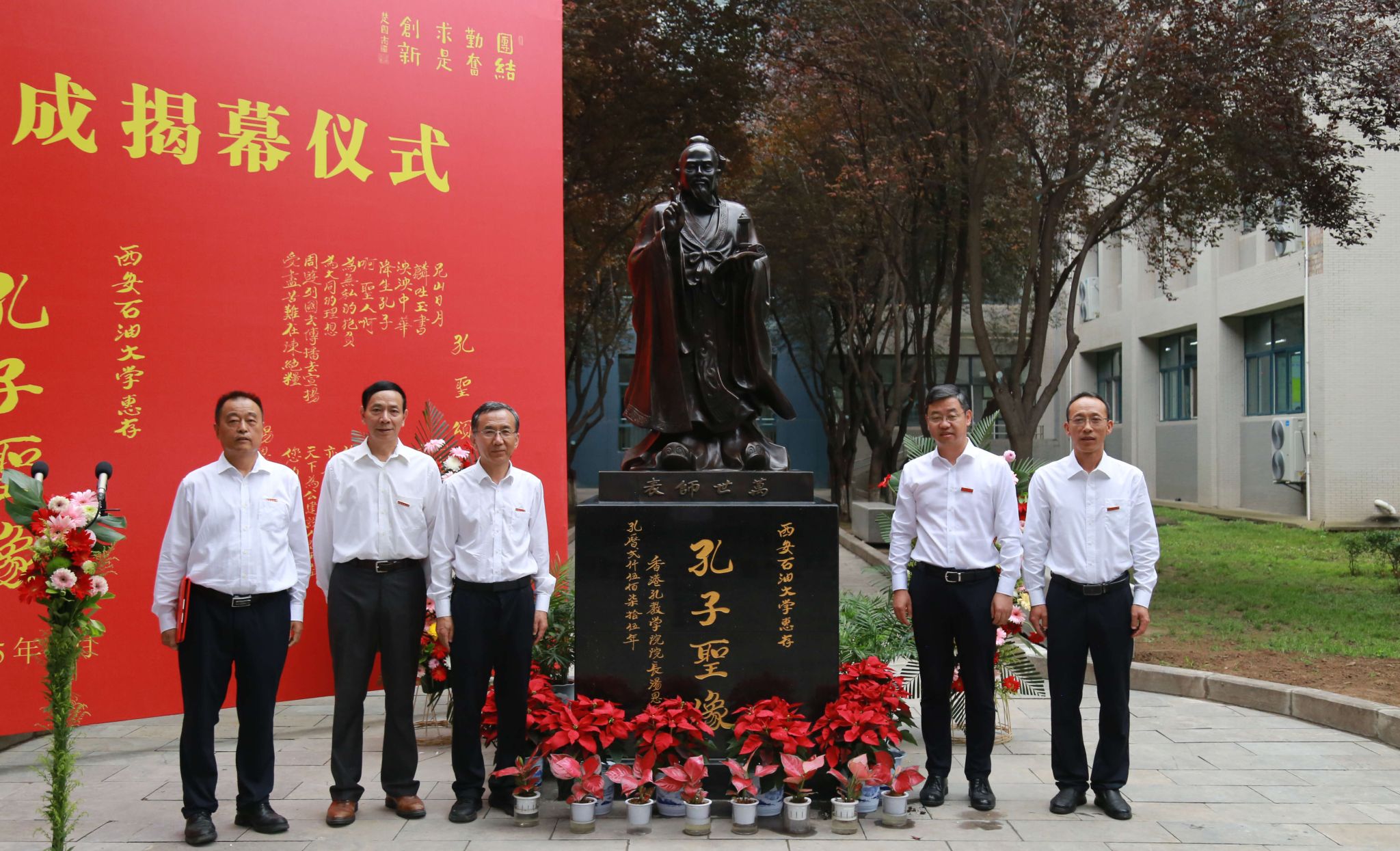在全體與會人員的共同見證下,王進富、張木、張君濤、周德勝共同為孔子銅像揭幕。全體領導、師生代表向孔子銅像行鞠躬禮。
