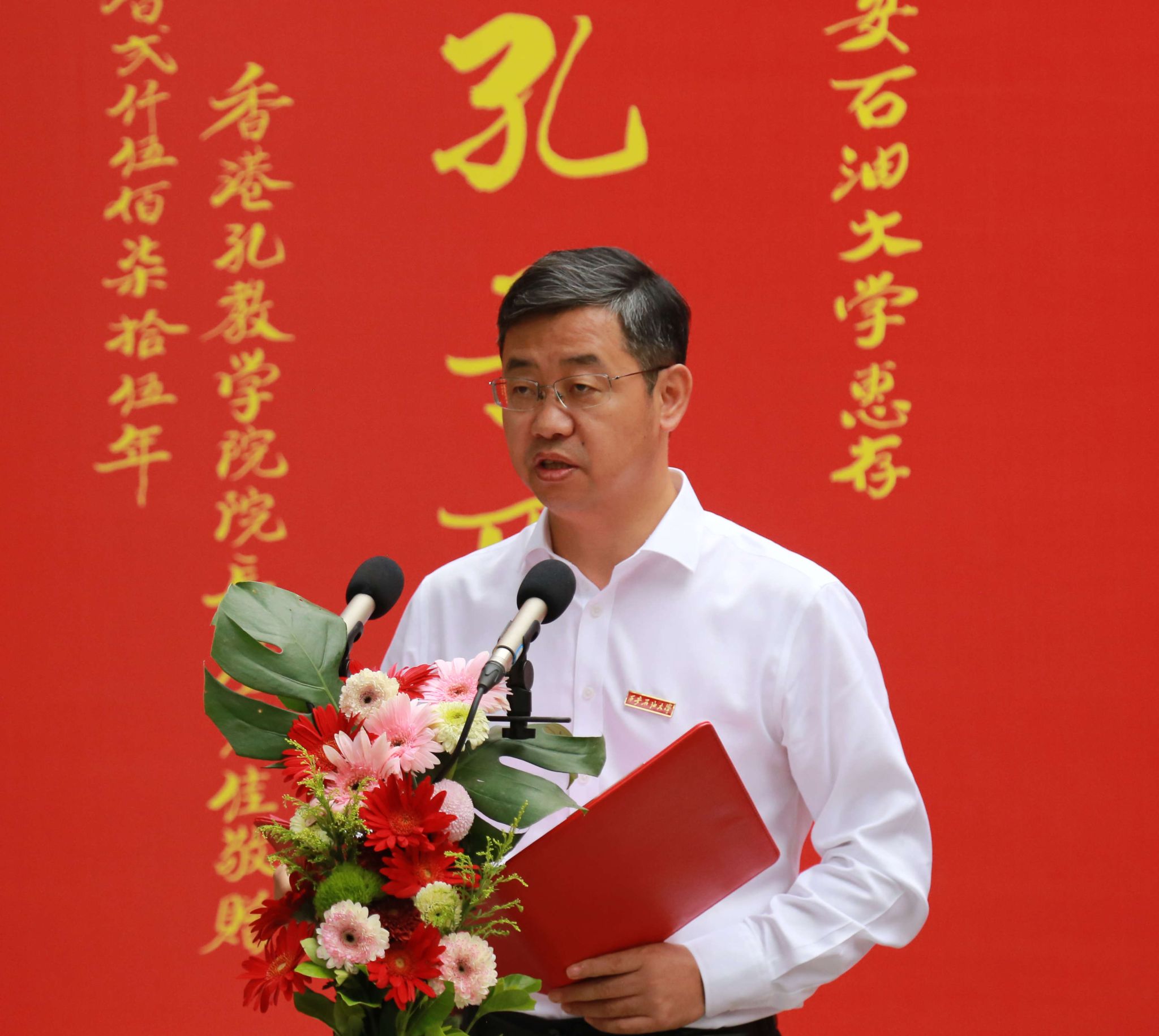 張木介紹了孔子銅像的捐贈背景,對捐贈方——香港孔教學院以及院長湯恩佳支持學校文化建設、弘揚中華優秀傳統文化的善舉表示衷心感謝,并闡述了豎立孔子像對于涵育校園文化、傳承教育精神的重要意義。他指出,孔子銅像的落成,將為校園增添一處人文精神地標,激勵師生修身立德、勤學篤行。