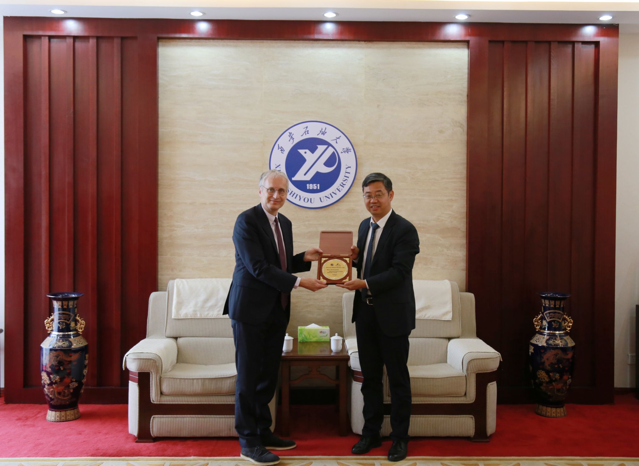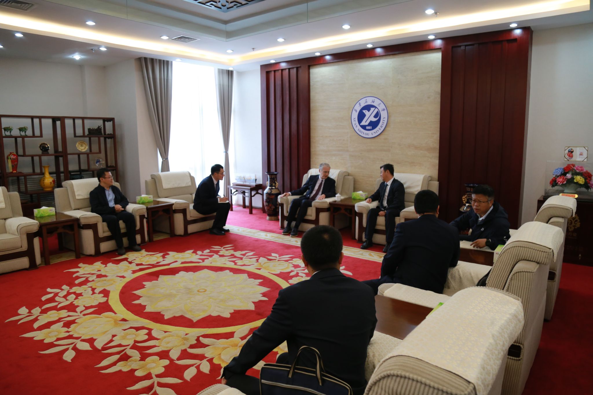 王進富代表學校對舍恩伯格教授的到訪表示熱烈的歡迎和衷心的感謝。他首先對能源行業面臨的智慧化問題、中國智慧油氣田開發發展現狀及我校目前致力于人工智能教學科研體系的改革作了簡要介紹,并表示希望通過此次交流,進一步提升我校人工智能領域的學科建設和科學研究水平。舍恩伯格教授對學校的邀請表達了感謝,并圍繞我校油氣能源、人工智能學科的發展、科研、人才培養等提出了建議。