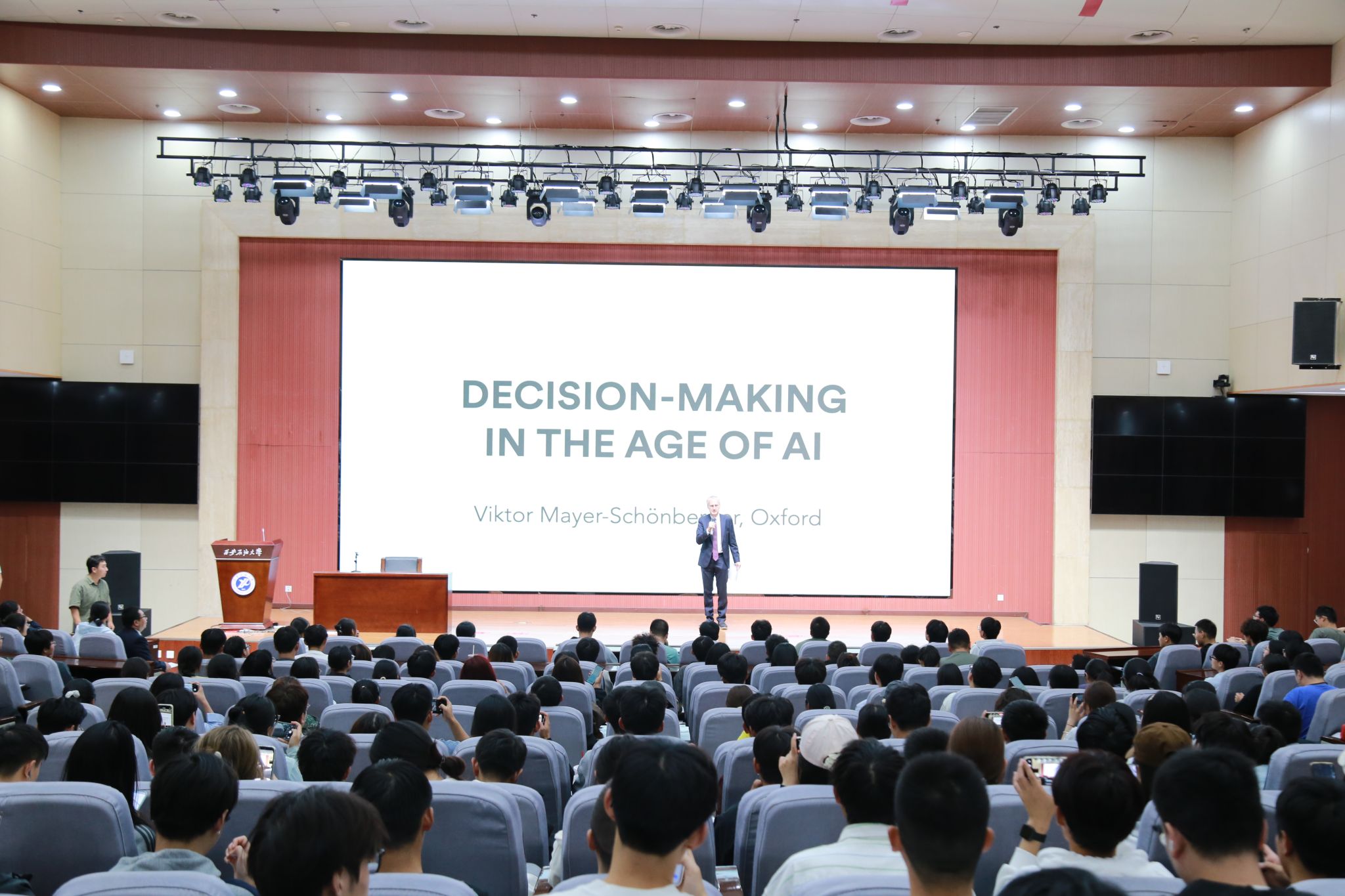 9月19日下午,我校第十四期終南山講壇在鄠邑校區圖書館弘石學術報告廳舉行。國際著名數據科學技術權威專家,牛津大學教授、耶魯大學、芝加哥大學客座教授,《大數據時代》作者維克托·邁爾-舍恩伯格(Mayer-Sch?nberger)教授受邀作了題為“Decision-Making in the Age of Ai”(人工智能時代的決策)的學術報告,帶來了一場關于數據、AI與人類決策智慧的學術盛宴。科研處、計算機學院有關負責人,理學院、計算機學院、電子工程學院師生等近400人參加報告。