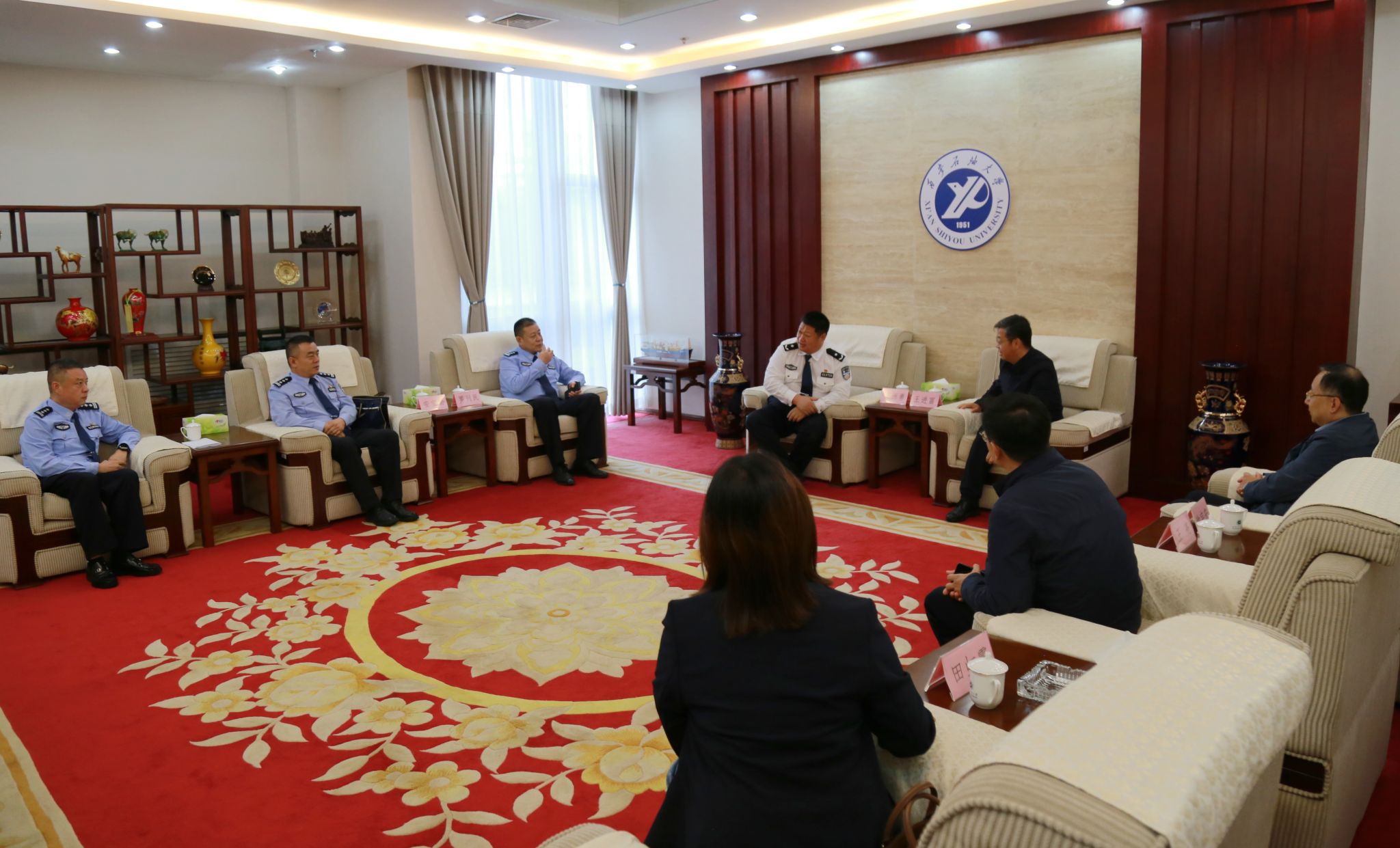 活動開始前,校長王進富在貴賓室會見了來校出席活動的鄠邑區副區長、公安分局局長、督察長吳洲勇一行,就學校在鄠邑區建設發展中的痛點、難點進行了深入交流,對關于進一步開展警校共治工作,切實提升學校教學科研優越環境交換了意見。