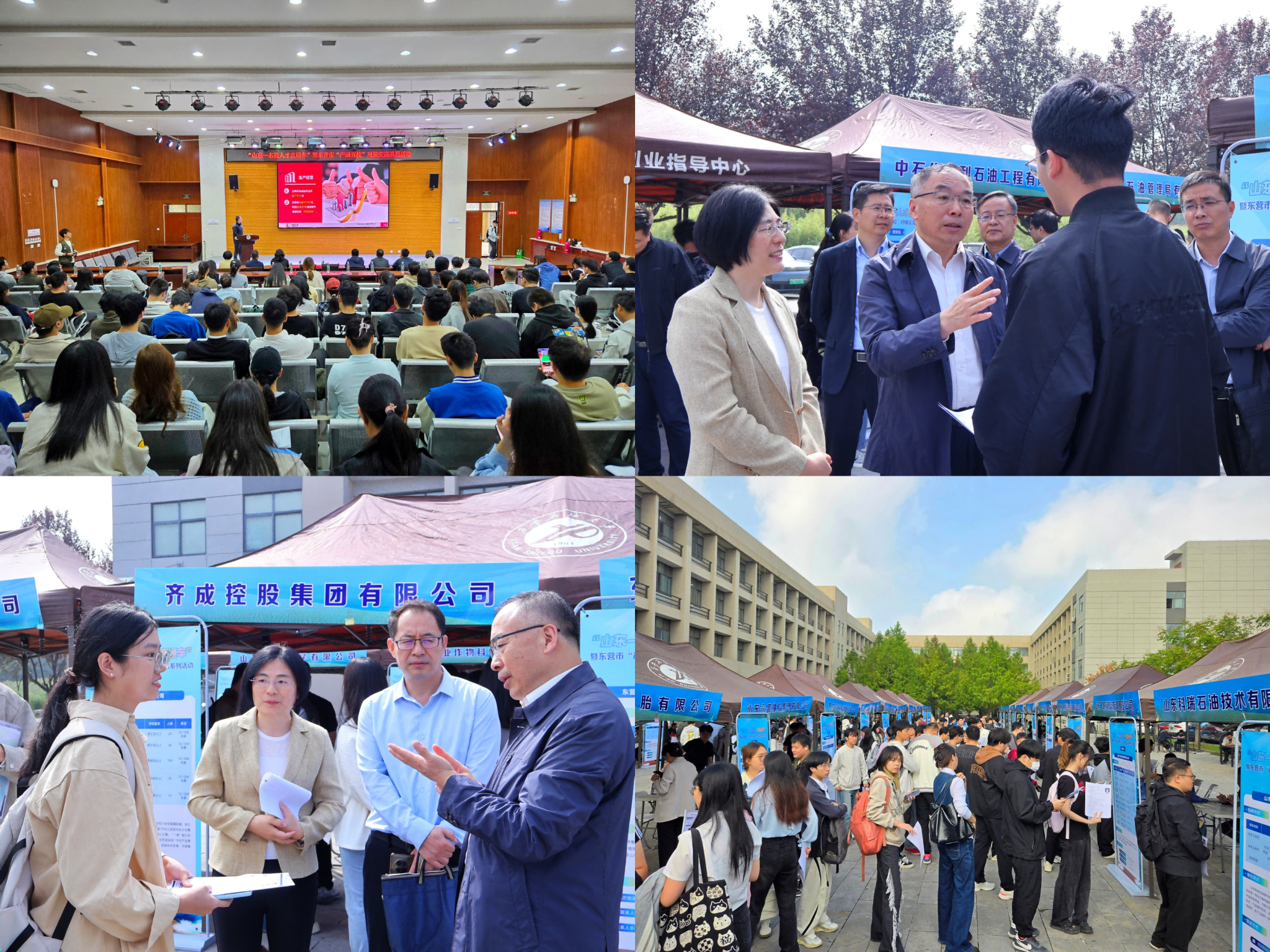 與此同時,東營市組團專場招聘會在崇文樓118報告廳和江漢林廣場同步開展,東營市公共就業和人才服務中心副主任朱鳳鸞詳細介紹了當地人才發展環境、住房補貼、就業扶持等優惠政策。多家重點企業代表圍繞企業主營業務、崗位需求、發展前景等內容進行宣講,現場解答學生關于職業規劃、崗位要求等疑問,吸引兩百余名畢業生到場聆聽,為畢業生與企業搭建起直接溝通的橋梁。宣講會后,省市領導在學校相關負責人陪同下前往招聘現場,實地查看畢業生求職情況。現場氣氛熱烈,畢業生們積極與企業招聘人員交流,圍繞崗位專業要求、薪資待遇、職業發展空間等問題深入咨詢,部分學生與企業初步達成就業意向。隨后,校地雙方領導參觀我校校史館及鐵人王進喜紀念館,通過歷史圖片、實物展品與文字介紹,全面了解我校的發展歷程、辦學成就與人才培養特色,對我校長期扎根能源領域、為國家能源事業發展作出的貢獻給予高度評價。