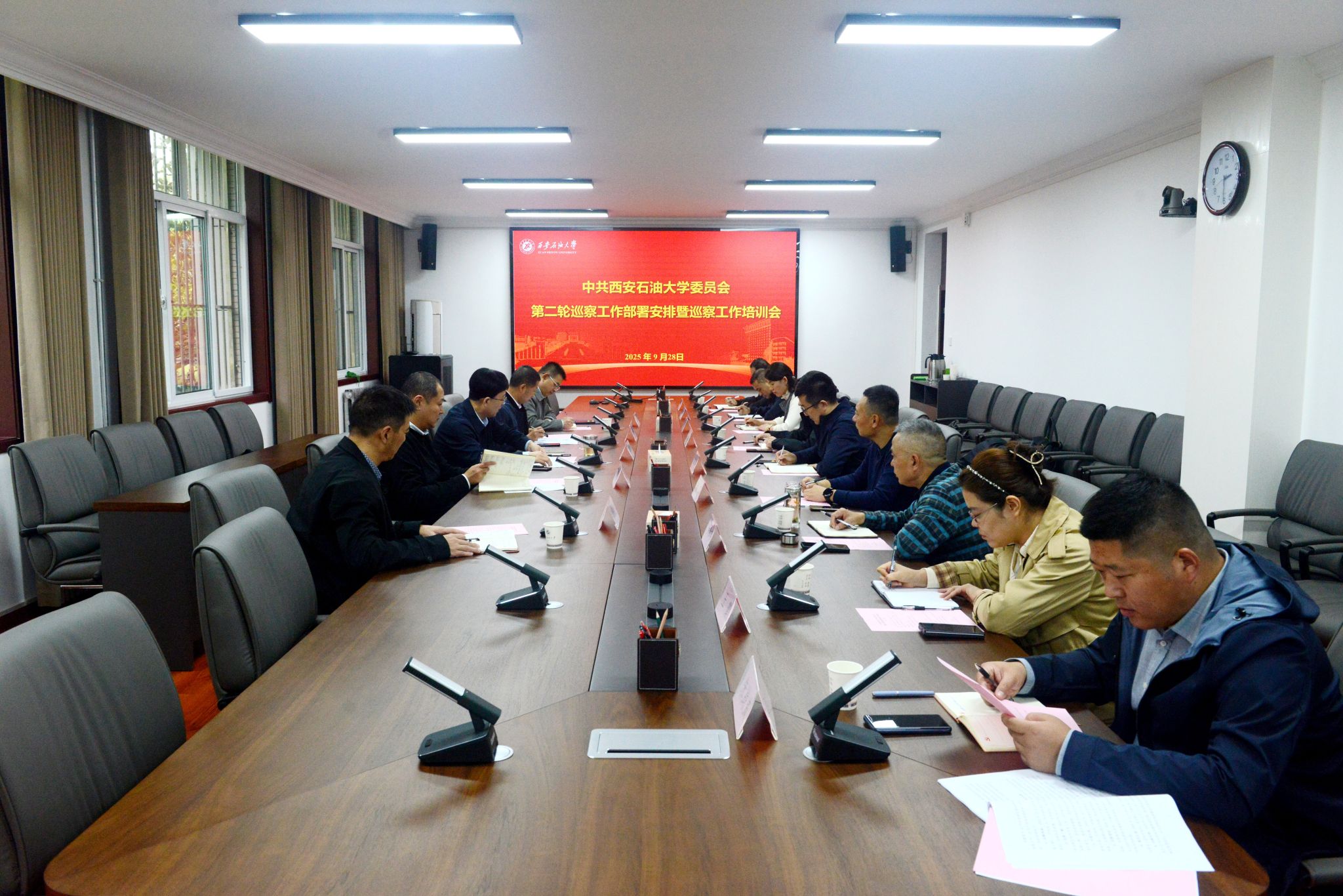9月28日下午,中共西安石油大學委員會第二輪巡察工作部署安排暨巡察工作培訓會在鄠邑校區辦公樓第三會議室召開,校黨委副書記、紀委書記、監察專員王輝強出席會議并講話,黨委巡察工作辦公室主任茍毅飛、黨委組織部部長高健磊以及第二輪巡察第一巡察組、第二巡察組全體成員參加會議。