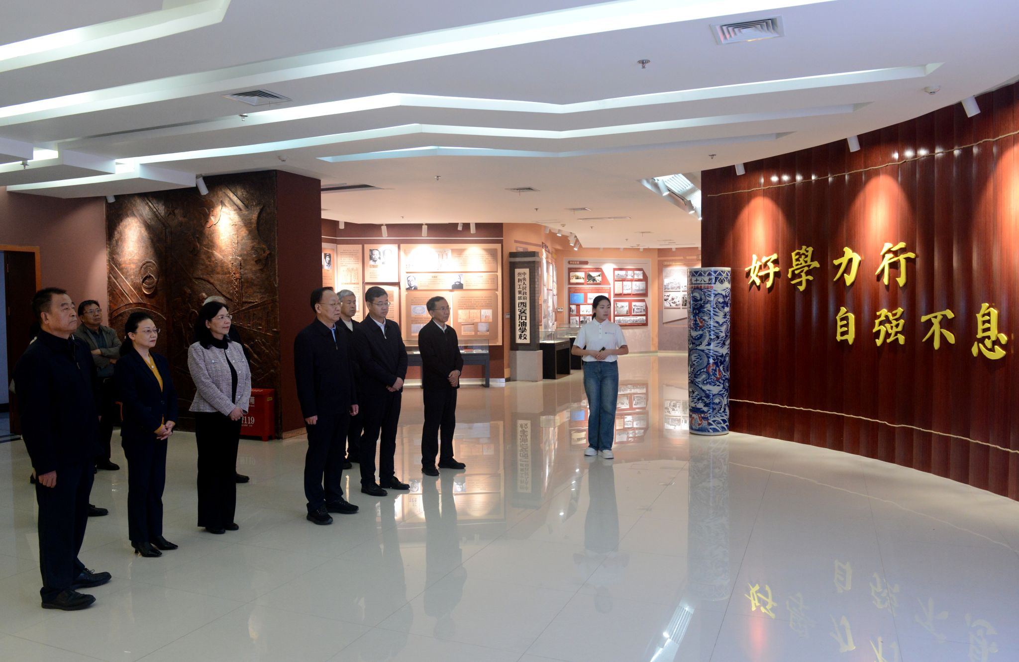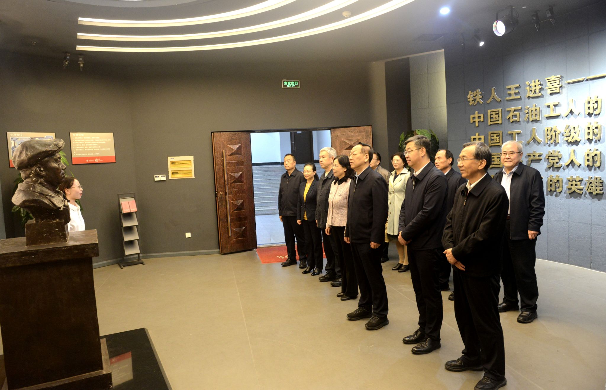 揭牌儀式前,全體人員懷著崇敬的心情前往杜斌丞雕像前敬獻花籃、鞠躬拜謁,深切緬懷。隨后參觀了鐵人王進喜紀念館和校史館。
