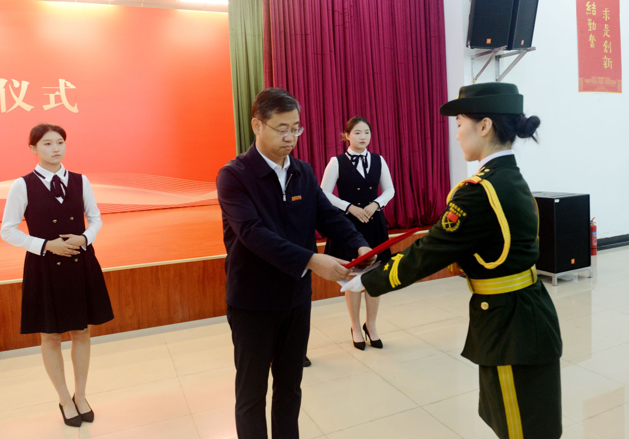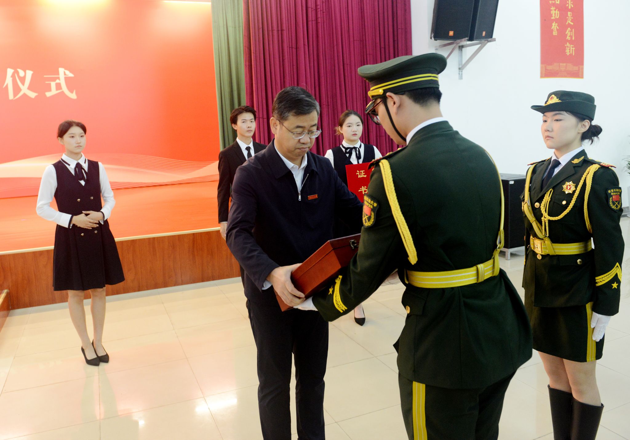 上午8時,儀式在莊嚴的氛圍中正式開始。校長王進富將獲贈的國旗及證書鄭重交予學校國旗護衛隊,國旗護衛隊隊員神情肅穆,步伐鏗鏘,莊嚴地護送國旗入場。這面國旗旗長5米、寬3.3米,為超大國旗,整幅旗面無拼接,五顆星由織造人員手工縫制,工藝特殊,承載著億萬中華兒女的深厚愛國情懷,也凝聚著我校建校70周年的特別紀念。