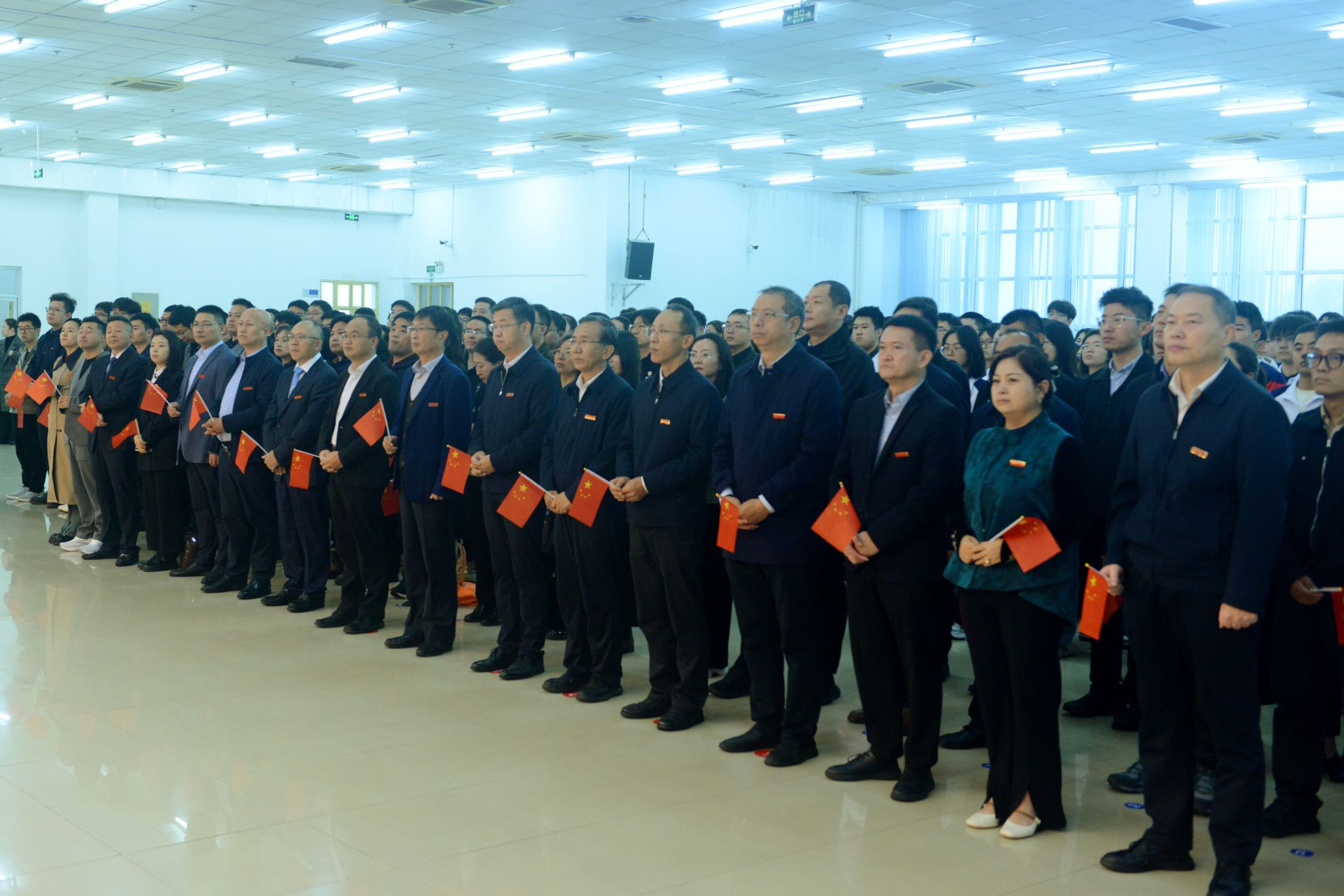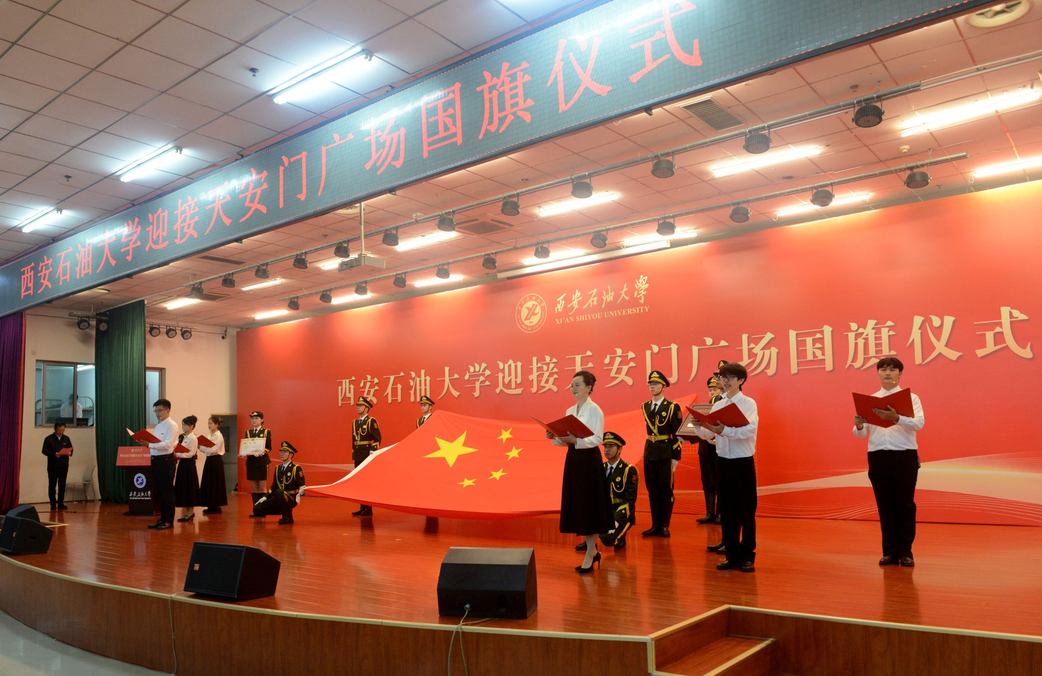 國旗護衛隊隊員奮力展旗,全場師生面向鮮艷的五星紅旗行注目禮并高唱國歌。師生代表深情朗誦了《國旗領航,“油”我擔當》,表達了西石大人扎根能源領域、矢志為國奉獻的堅定決心。