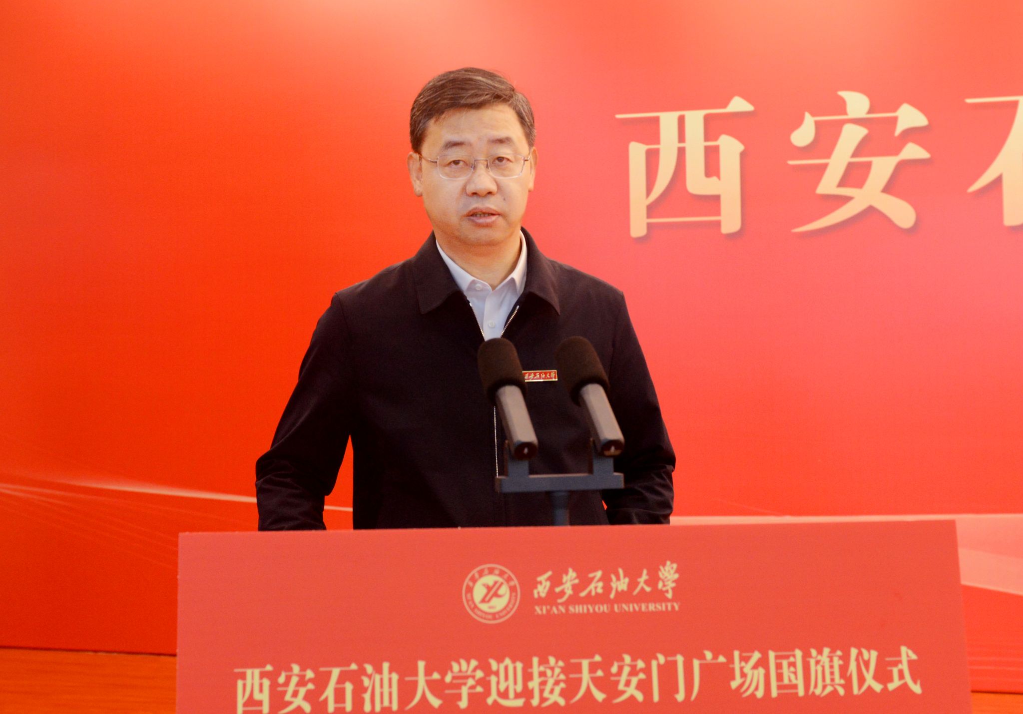 校長王進富發表致辭,他總結回顧了學校74年來與黨和國家同向同行、為祖國能源事業不懈奮斗的辦學歷程,強調學校始終“以‘石’為基、以‘油’鑄魂”, 在服務國家能源戰略中彰顯使命擔當,培養了一批又一批能源領域的棟梁之才。他向全體師生提出三點希望:一是希望全體師生高擎信仰之炬,把弘揚愛國主義精神作為永恒主題。要持續發揮好這面國旗的愛國主義教育功能,開展內容豐富、形式多樣的愛國主義教育活動,營造愛黨愛國、愛校榮校的濃厚氛圍;二是希望全體師生堅定強國信念,把踐行奮斗實干擔當作為精神底色。要堅持石油精神辦學、鐵人精神育人、延安精神鑄魂,秉承“愛國奉獻、艱苦奮斗、科學求實、開拓進取”的辦學精神,全面落實立德樹人根本任務,不斷提升服務國家能源戰略與區域發展的能力,在教育強國建設中展現更大作為;三是希望全體師生挺膺擔當之志,把矢志能源報國使命作為畢生追求。廣大教師要弘揚教育家精神,以赤誠之心、奉獻之心、仁愛之心教書育人,做學生成長的引路人,廣大學子要秉承“好學力行、自強不息”的校訓,傳承鐵人精神,將使命扛在肩頭,為國家能源事業貢獻青春力量。