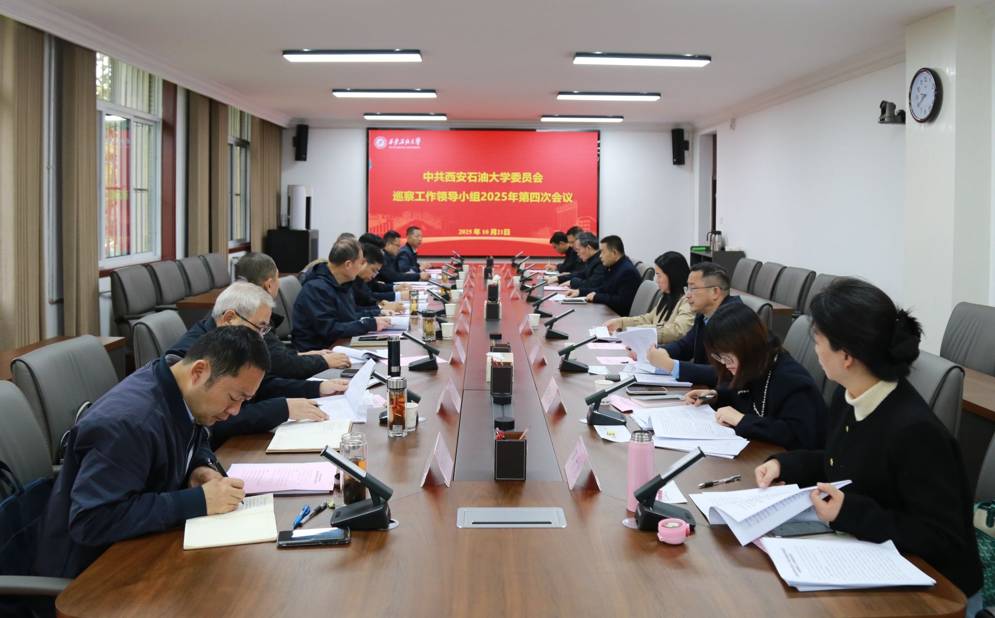 10月21日上午,學校黨委巡察工作領導小組2025年第四次會議在鄠邑校區第三會議室召開,聽取第三屆黨委第一輪巡察整改工作總體情況匯報和四個被巡察院(系)黨組織整改落實情況匯報。校黨委副書記、校長王進富出席會議并講話。校黨委副書記、紀委書記、監察專員,校黨委巡察工作領導小組副組長王輝強主持會議。黨委辦公室、紀檢監察機構、黨委巡察工作辦公室、黨委組織部、黨委宣傳部、黨委統戰部、黨委學生工作部、黨委教師工作部、黨委保衛部、研究生工作部、審計處主要負責人和第一輪巡察四個被巡察院(系)黨委(黨總支)書記參加會議。