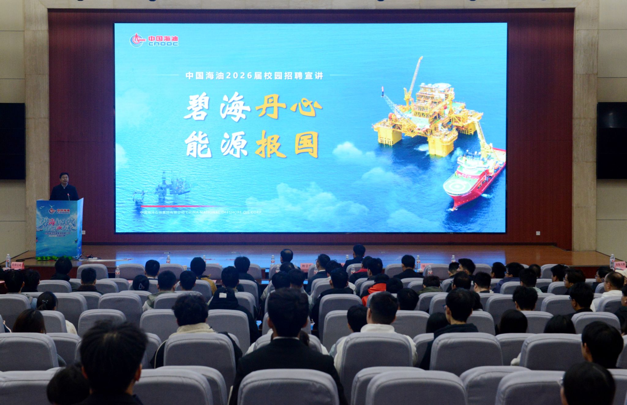 10月21日上午,中國海洋石油集團有限公司2025年秋季校園招聘宣講會在我校鄠邑校區弘石學術報告廳舉行。副校長種宇宏出席會議。中國海油各單位招聘代表,學校就業創業指導中心全體成員,各院(系)學生工作主要負責同志,畢業班輔導員,2026屆畢業生代表300余人參加會議。會議由學生工作部(處)部(處)長、就業創業指導中心主任王亮主持。
