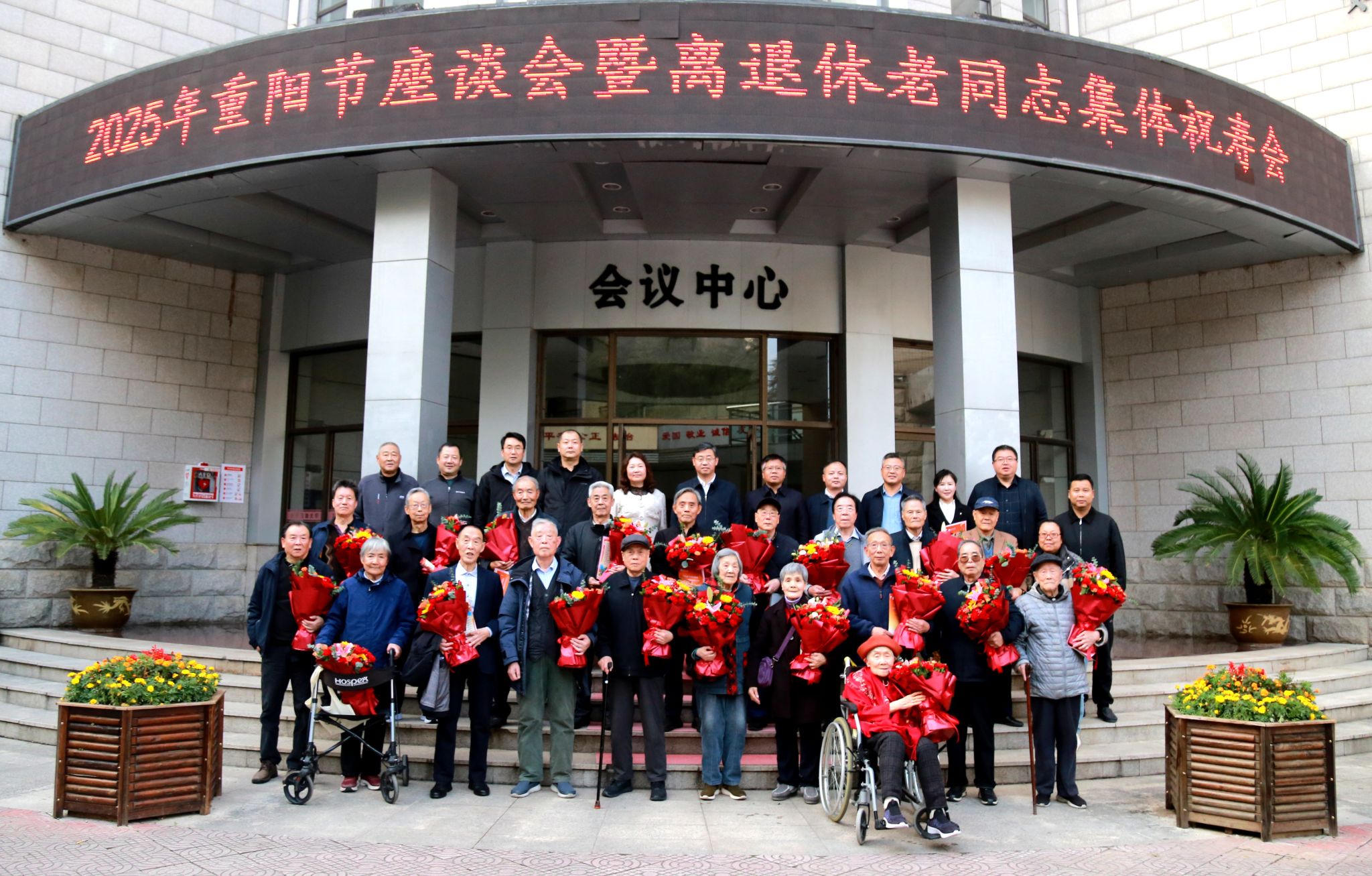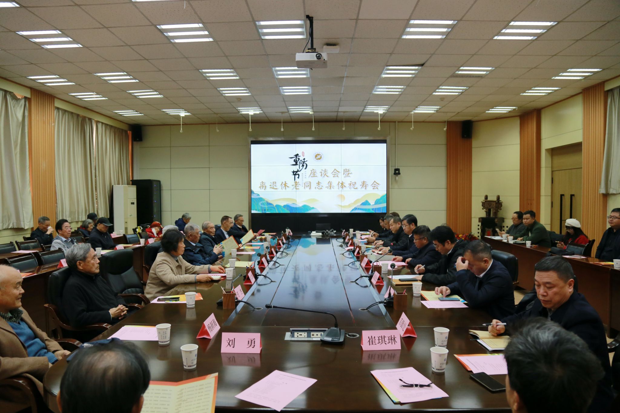 會后,學校領導與老壽星代表合影留念。組織部、人事處、教務處、后勤處、離退休工作處、校醫院等單位負責人參加會議。