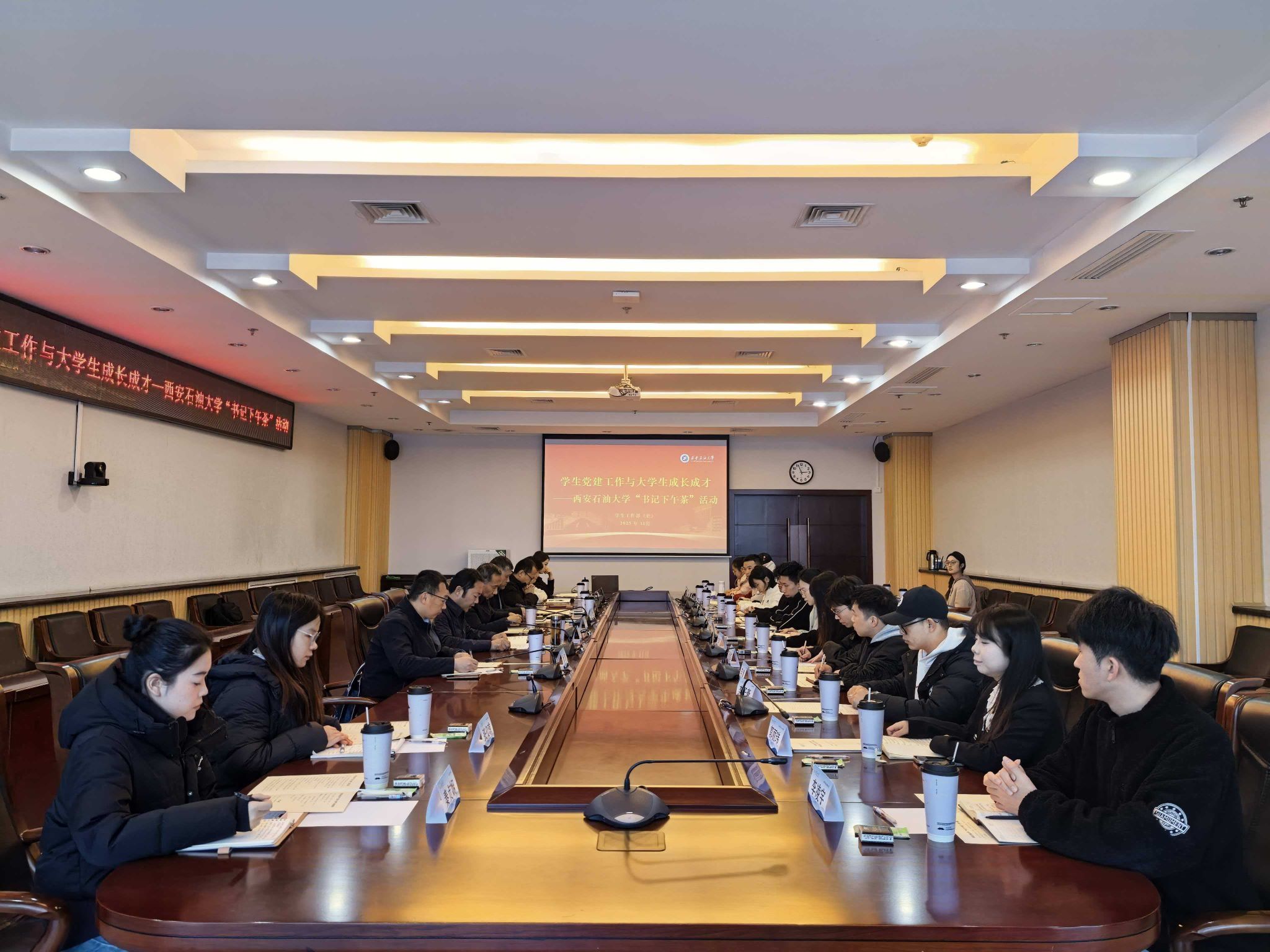 為進一步推進校園文化建設(shè),豐富師生交流平臺,切實傾聽學(xué)子心聲,助力青年學(xué)生成長成才,11月18日下午,我校“書記下午茶”活動在鄠邑校區(qū)圖書館第二會議室順利舉行。校黨委副書記張木出席活動,與來自各院(系)的18名本科、碩士研究生圍繞“學(xué)生黨建工作與大學(xué)生成長成才”主題展開深入交流。黨委組織部、研究生院、研究生工作部、校友工作與合作交流處負責(zé)人參會,黨委學(xué)生工作部負責(zé)人主持活動。