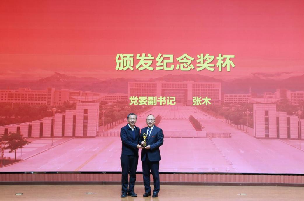 張木滿懷深情地宣讀《騰輝助學金廿周年慶典紀念冊》親筆序言,追憶1988年與何榮校友相識的點滴,激動與感恩之情溢于言表,他深情地贊嘆何榮校友求學時的奮進拼搏,與事業維艱之時仍堅持回饋母校的赤子情懷。隨后,張木為何榮校友頒發“廿年初心?資助育人功勛獎”紀念獎杯,那沉甸甸的獎杯滿載著全校師生對他二十年堅守育人初心的崇高敬意,現場掌聲經久不息。
