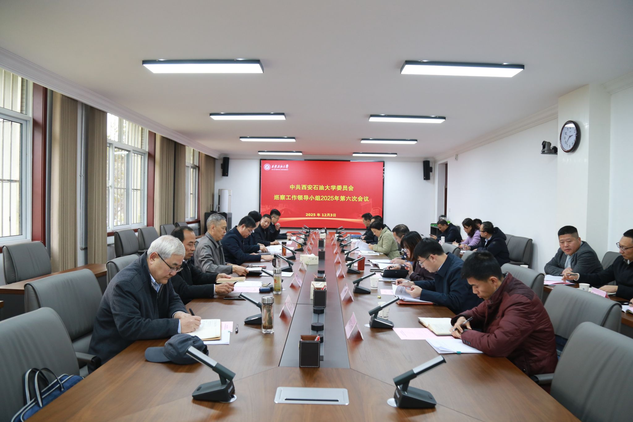 12月3日下午,學(xué)校黨委巡察工作領(lǐng)導(dǎo)小組在鄠邑校區(qū)辦公樓第三會議室召開2025年第六次會議,聽取第三屆黨委第二輪巡察工作總體情況匯報,審議四個被巡察學(xué)院黨委的巡察情況報告。校黨委副書記、校長王進富出席會議并講話。校黨委副書記、紀(jì)委書記、監(jiān)察專員,黨委巡察工作領(lǐng)導(dǎo)小組副組長王輝強主持會議。學(xué)校黨委巡察工作領(lǐng)導(dǎo)小組成員單位負(fù)責(zé)人參加會議。黨委第一、第二巡察組和黨委巡察辦全體同志列席會議。