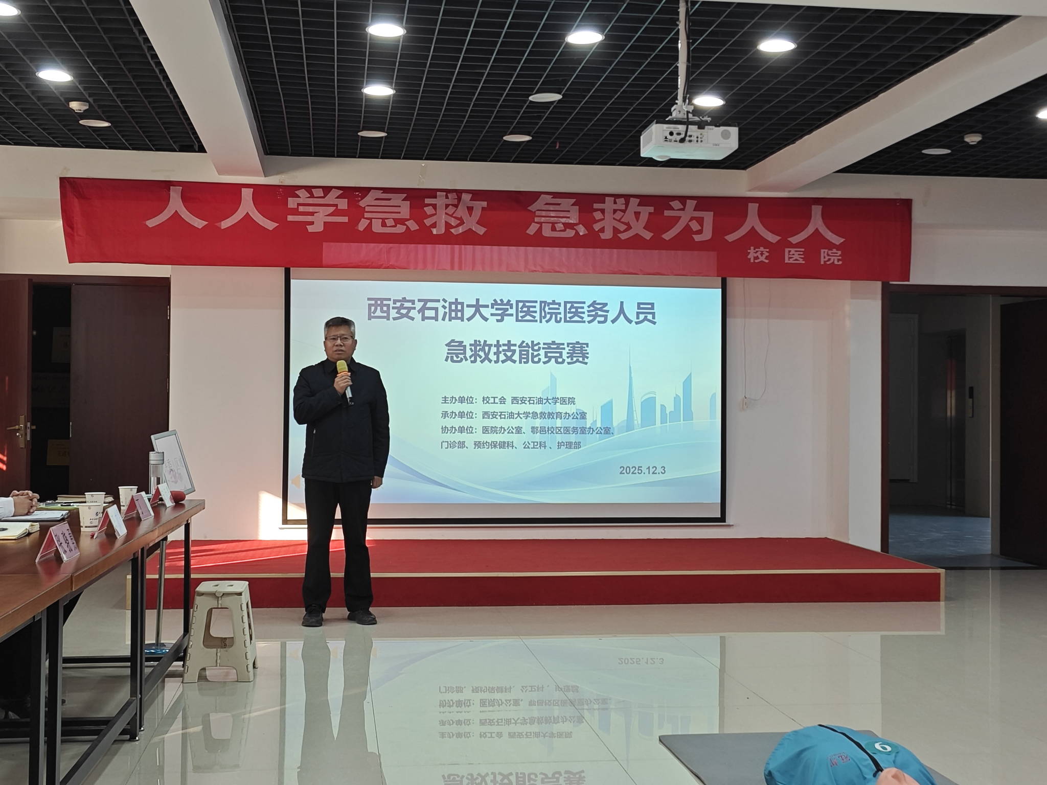 為進一步錘煉醫(yī)務人員急救專業(yè)素養(yǎng),提升校園應急處置工作水平,筑牢師生生命健康安全防線,12月3日,學校在鄠邑校區(qū)醫(yī)院舉辦醫(yī)務人員急救技能競賽。副校長張驍勇出席活動并講話,校工會、校醫(yī)院相關負責人及全體醫(yī)務人員參加。