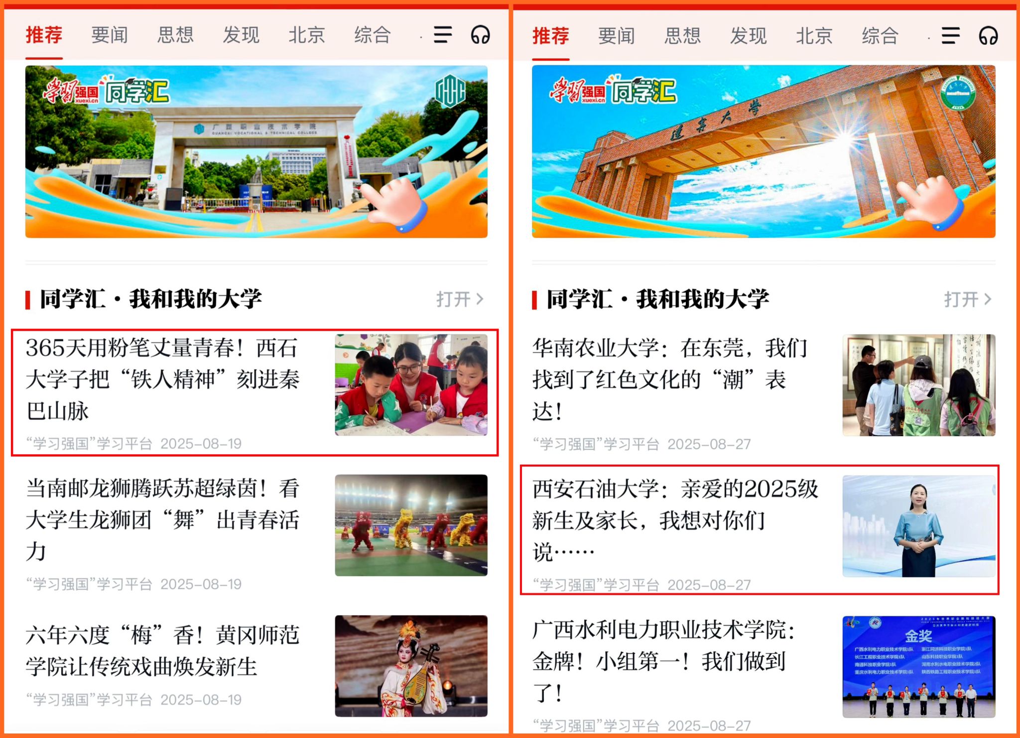 “同學(xué)匯”是“學(xué)習(xí)強(qiáng)國”學(xué)習(xí)平臺為貫徹落實習(xí)近平總書記關(guān)于加強(qiáng)和改進(jìn)高校思想政治工作的重要論述,面向高校、服務(wù)大學(xué)生而研發(fā)的一款主流融媒體產(chǎn)品,支持高校發(fā)布圖文、短視頻等多種形式內(nèi)容。2025年以來,“西安石油大學(xué):祝你高考落筆生花,共赴能源報國夢”“西安石油大學(xué)學(xué)子暑假在干嘛?看這里”“365天用粉筆丈量青春!西石大學(xué)子把‘鐵人精神’刻進(jìn)秦巴山脈”“西安石油大學(xué):親愛的2025級新生及家長,我想對你們說……”等內(nèi)容多次獲得“學(xué)習(xí)強(qiáng)國”學(xué)習(xí)平臺“推薦”頻道相關(guān)欄目首頁推薦。學(xué)校12次上榜一月一期的“學(xué)習(xí)強(qiáng)國”同學(xué)匯高校榜,進(jìn)一步提高了學(xué)校的影響力和美譽(yù)度。