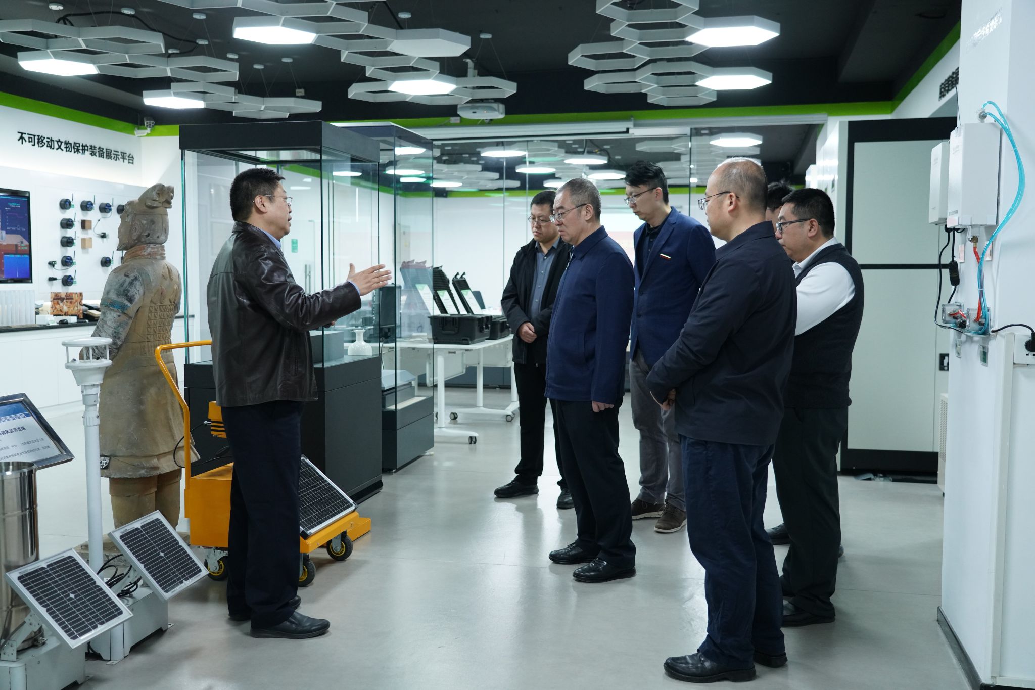 交流座談前,常江一行參觀了西安元智系統技術有限責任公司展廳,詳細了解了企業在文化遺產保護、文物監測、數字化傳承等領域的技術成果和應用案例。
