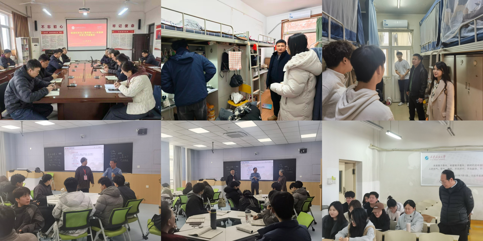 地球科學(xué)與工程學(xué)院以保障開學(xué)工作有序推進為目標(biāo),3月2日召開新學(xué)期工作部署會,對學(xué)院新學(xué)期各項工作進行再動員、再部署。學(xué)院領(lǐng)導(dǎo)班子深入學(xué)生宿舍、教室、實驗室和職工之家,實地了解教師上課狀況,檢查學(xué)生返校報到、課堂出勤與學(xué)習(xí)狀態(tài),聽取師生意見建議,全面了解新學(xué)期開學(xué)運行情況,確保教學(xué)秩序平穩(wěn)有序。3月4日學(xué)院全體學(xué)工干部會上,就隊伍作風(fēng)建設(shè)、學(xué)生思想教育、校園安全穩(wěn)定、學(xué)生就業(yè)考研、企業(yè)導(dǎo)師聘任及深入宿舍和課堂等工作作了強調(diào)和要求,輔導(dǎo)員通過組織學(xué)生簽到、深入課堂和宿舍等方式,了解學(xué)生思想情況和上課狀態(tài),結(jié)合上學(xué)期成績狀況,有針對性地開展教育引導(dǎo);走訪過程中,畢業(yè)班輔導(dǎo)員結(jié)合個人發(fā)展意愿與當(dāng)前就業(yè)形勢,并就崗位信息對接等方面提出指導(dǎo)建議,切實助力畢業(yè)生實現(xiàn)高質(zhì)量就業(yè)。各年級通過召開年級大會、主題班會等形式,開展內(nèi)容豐富、形式多樣的主題教育活動。本科生導(dǎo)師面對面交流、企業(yè)導(dǎo)師聘任等工作有序推進、落地見效。學(xué)生參與學(xué)科競賽熱情高漲,學(xué)院整體育人工作氛圍濃厚向上。