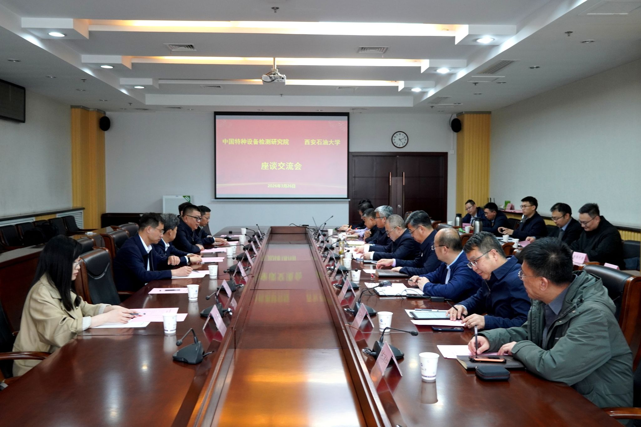 在交流環(huán)節(jié),中國特種設(shè)備檢測(cè)研究院介紹了科研情況及合作需求,我校相關(guān)學(xué)院和科研團(tuán)隊(duì)代表介紹了在油氣儲(chǔ)運(yùn)安全、材料腐蝕與防護(hù)、智能檢測(cè)技術(shù)等方面的特色科研成果。雙方與會(huì)人員圍繞科研協(xié)同攻關(guān)、關(guān)鍵核心技術(shù)突破、聯(lián)合申報(bào)科研項(xiàng)目、共建科研平臺(tái)、人才聯(lián)合培養(yǎng)等方面進(jìn)行了深入交流與務(wù)實(shí)探討。大家一致認(rèn)為,雙方科研方向高度契合,資源優(yōu)勢(shì)互補(bǔ),合作潛力巨大,此次交流為雙方深化科研合作、實(shí)現(xiàn)協(xié)同創(chuàng)新奠定了堅(jiān)實(shí)基礎(chǔ)。