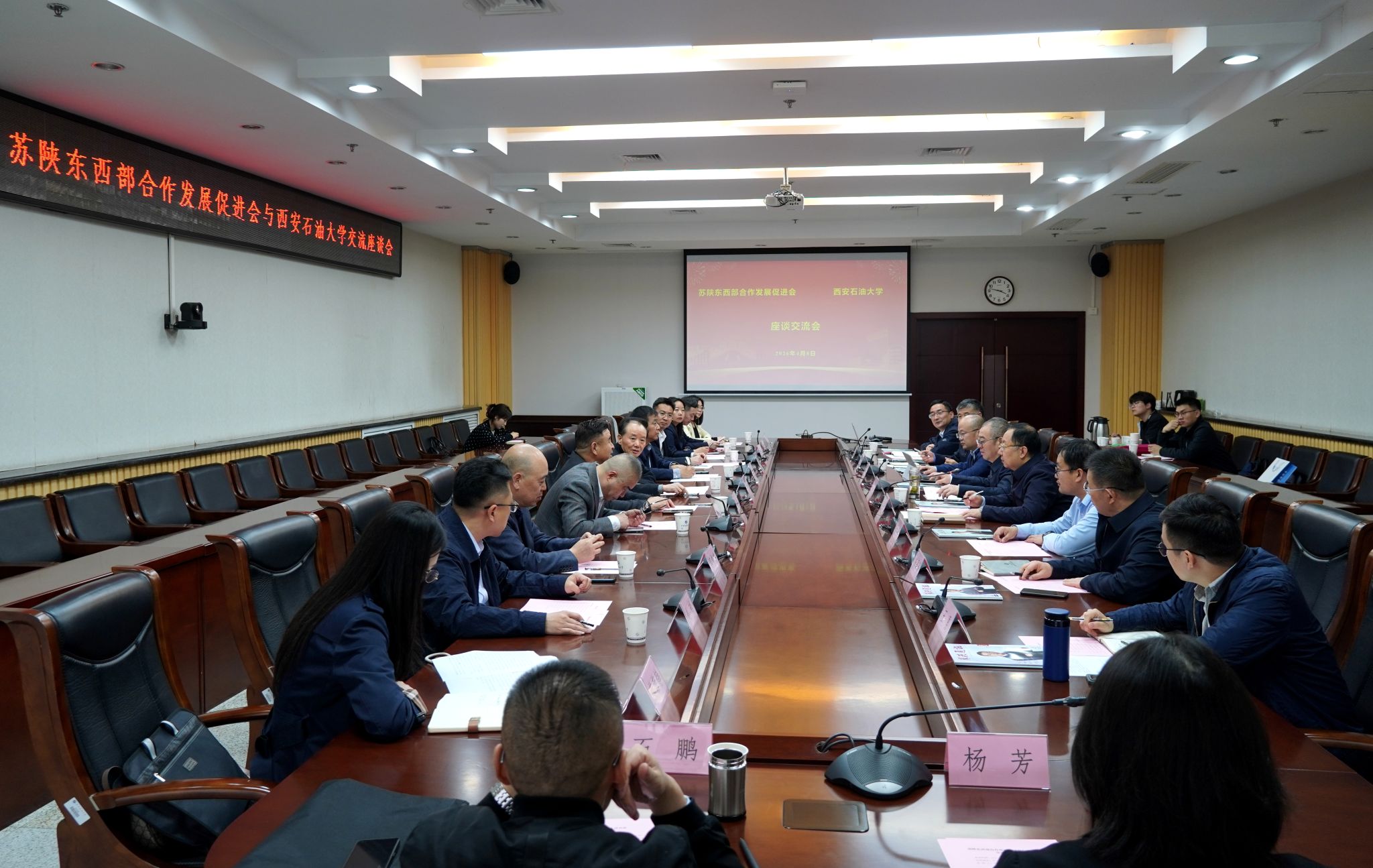 常江對(duì)劉浩春一行表示熱烈歡迎,并介紹了學(xué)校辦學(xué)歷史、學(xué)科特色與創(chuàng)新發(fā)展情況。他指出,西安石油大學(xué)由習(xí)仲勛等老一輩無(wú)產(chǎn)階級(jí)革命家關(guān)懷創(chuàng)立,是西北地區(qū)唯一以石油石化為特色的高校,建校以來(lái)始終堅(jiān)守“石油精神辦學(xué)、鐵人精神育人、延安精神鑄魂”辦學(xué)理念,牢記“端牢能源飯碗”重大囑托,聚焦油氣全產(chǎn)業(yè)鏈與能源新質(zhì)生產(chǎn)力,構(gòu)建產(chǎn)學(xué)研深度融合體系,著力培養(yǎng)能源領(lǐng)域高素質(zhì)創(chuàng)新人才。他強(qiáng)調(diào),學(xué)校國(guó)際化辦學(xué)成果豐碩,高質(zhì)量布局土庫(kù)曼斯坦魯班工坊、烏茲別克斯坦分校、阿塞拜疆中阿聯(lián)合大學(xué),深度融入“一帶一路”建設(shè),構(gòu)筑起面向中亞、開(kāi)放共贏的國(guó)際化辦學(xué)新格局。蘇陜東西部合作發(fā)展促進(jìn)會(huì)是深化蘇陜合作、推進(jìn)東西部協(xié)作的服務(wù)聯(lián)絡(luò)橋梁、經(jīng)濟(jì)協(xié)作紐帶、創(chuàng)新平臺(tái)載體,希望促進(jìn)會(huì)加大對(duì)學(xué)校產(chǎn)教融合的支持力度,推動(dòng)相關(guān)企業(yè)與學(xué)校在人才培養(yǎng)、科技創(chuàng)新、成果轉(zhuǎn)化等方面深度合作,服務(wù)加快發(fā)展新質(zhì)生產(chǎn)力,助力蘇陜經(jīng)濟(jì)社會(huì)高質(zhì)量發(fā)展,為保障國(guó)家能源安全、強(qiáng)國(guó)建設(shè)、民族復(fù)興偉業(yè)提供有力支撐。