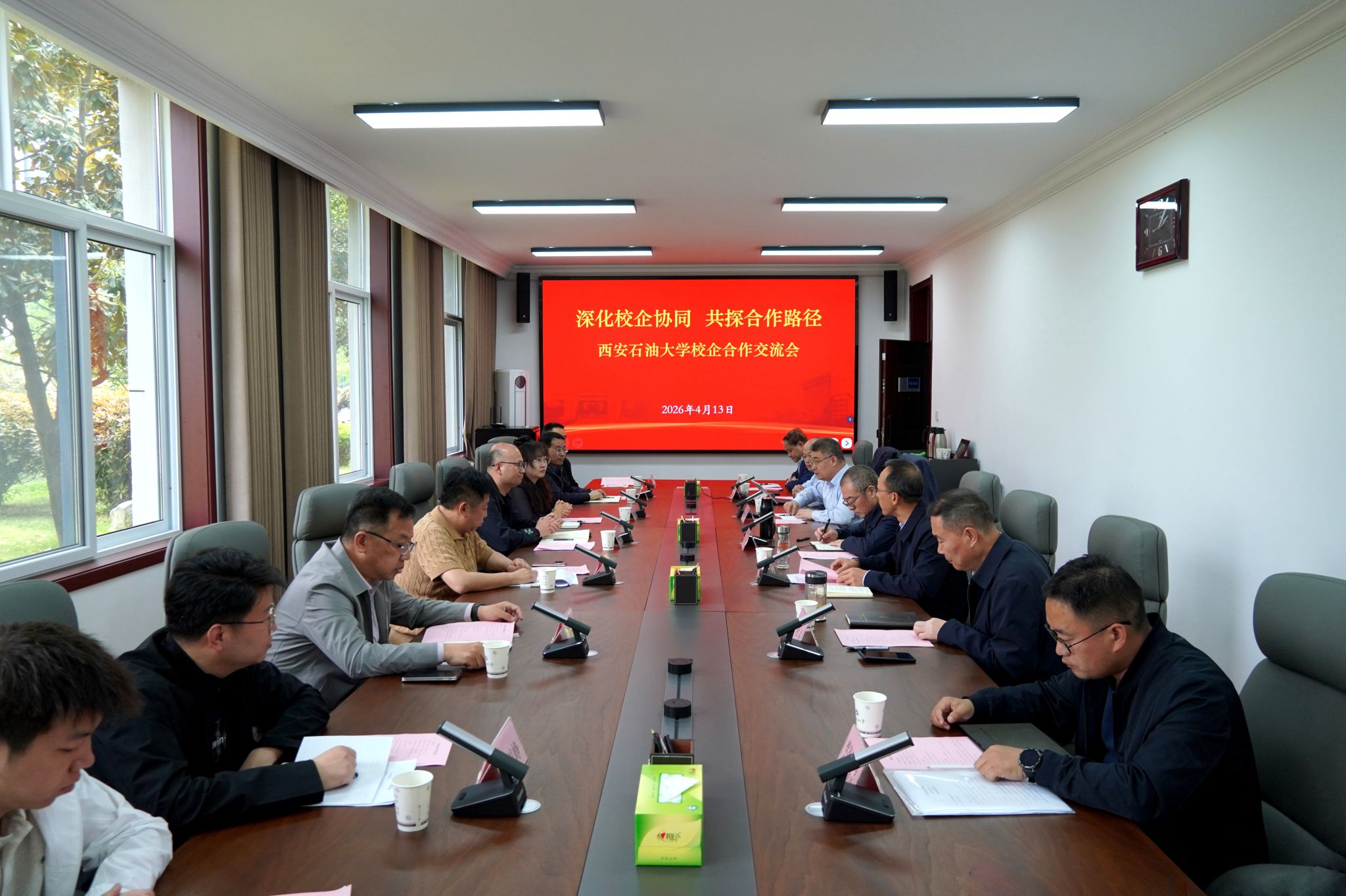 4月13日下午,我校與定邊縣產(chǎn)業(yè)園區(qū)管委會、定邊縣定慶資源能源管理服務(wù)有限公司、陜西智誠運勢實業(yè)集團有限公司校企合作交流會在鄠邑校區(qū)第五會議室召開。校黨委書記常江,腐植酸生態(tài)項目技術(shù)團隊負責(zé)人田原宇教授,定邊縣產(chǎn)業(yè)園區(qū)管委會黨工委委員、副主任魏延平,定慶資源能源管理服務(wù)有限公司副總經(jīng)理白慧萍,陜西智誠運勢實業(yè)集團有限公司總經(jīng)理馮智及公司相關(guān)負責(zé)人出席會議。副校長張君濤主持交流會。會議以“深化校企協(xié)同,共探合作路徑”為主題,聚焦產(chǎn)學(xué)研融合、技術(shù)創(chuàng)新與人才培養(yǎng),共謀校地、校企合作新篇章。