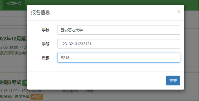 2、登錄成功后點擊“考試中心”,點擊對應的場次,如英語一(或英語二)“去報名”,填寫好自己的個人信息,點擊確定后即可報名成功,要保證個人信息無誤,避免影響成績。(班級可忽略)