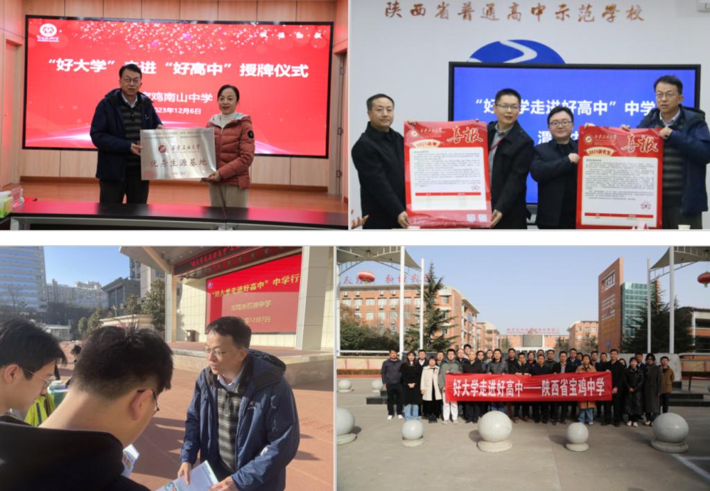 12月7日上午,在寶雞市石油中學,王成和張偉兩位副校長對大學老師的到來表示熱烈歡迎,在討論了高招工作中高中和大學合作意向以及授牌和優秀畢業生考研喜報后,工作組在該校體育場對高三學生開展招生宣傳工作,并發放招生宣傳資料。在寶雞金臺中學,首先校內對高三學生進行招生宣傳,答疑解惑,發放招生宣傳資料,再和各高校一起與校方座談,呈送今年錄取的優秀學生和學生考研的喜報,高效完成寶雞市的招生宣傳走訪、喜報呈送及優秀生源基地掛牌工作。這次寶雞之行新增優秀生源基地1個,在5所學校進行了招生宣傳,招生宣傳工作取得圓滿成功。