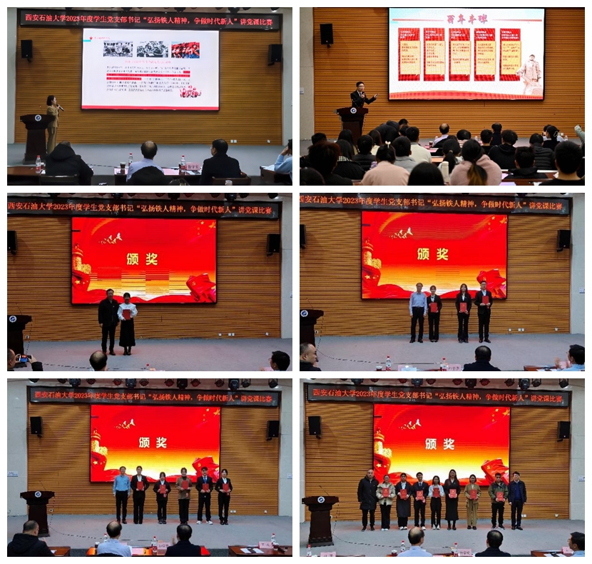 為全面提高學生黨員教育培養質量,激發大學生黨員責任意識和擔當意識,12月9日下午,學校2023年度學生黨支部書記“弘揚鐵人精神,爭做時代新人”講黨課比賽決賽在鄠邑校區就業指導中心多功能廳舉行。學校部分黨群部門負責人擔任比賽評委,各院(系)學生工作辦公室主任、組織員和全校近300名黨員代表觀摩了比賽。