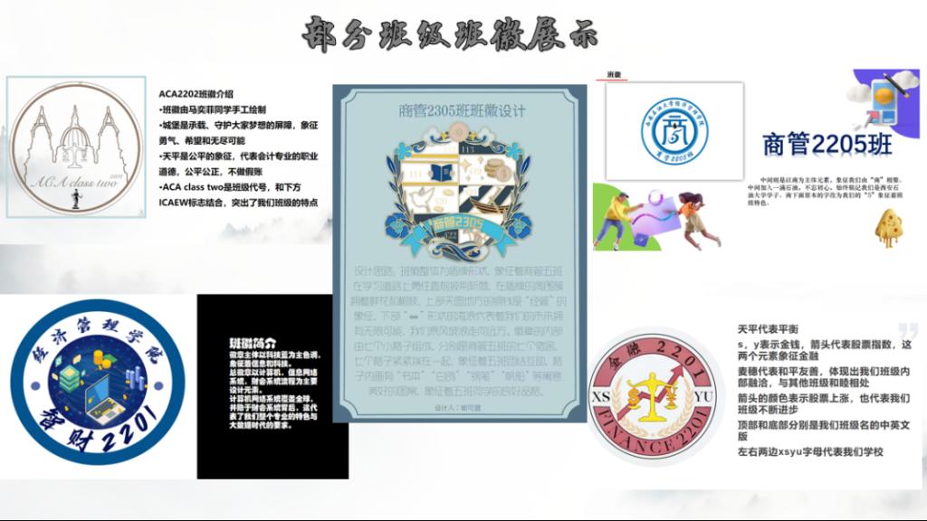 本次大賽參賽對象為學院2022級、2023級各班級,自11月初開始作品征集,鼓勵班級全體成員參與設計,群策群力,發揮自身特長。經過首輪評審,共有11個班級進入決賽。在決賽中,各班以視頻、PPT、舞蹈、朗誦等形式全方位展示班級風采。商管2305班以初心如磐,行穩致遠,堅定信仰,奮楫篤行作為他們的行為規范,“在青春路上盡情展現自我”是他們的班級特色,班歌《我的未來式》體現了商管2305班同學對未來的期望與憧憬,以及敢于追夢,爭取圓夢的斗志與激情。智財2201將“智勇雙全,愛拼財會贏”作為本班的班訓,班徽設計主體以科技藍為主色調,象征著信息和科技,融合信息網絡系統,財會系統流程等設計元素。國貿2202班以“嚴于律己,寬以待人”為關鍵詞,勉勵每一位同學變得更好,更加優秀?!凹纫鐾强?,又要腳踏實地”是他們的宣言。經過激烈的角逐,商管2305班榮獲一等獎,智財2201班和國貿2202班榮獲二等獎,商務2301班、ACA2302班、商管2304班榮獲三等獎,商管2205班、金融2201班、ACA2202班、ACA2301班、商管2308班榮獲優秀獎。
