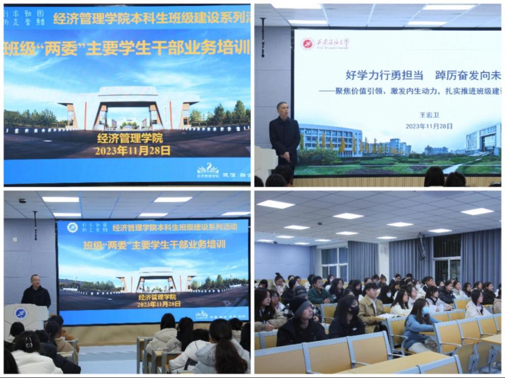 11月28日,經濟管理學院班級“兩委”主要學生干部業務培訓在鄠邑校區博覽樓110智慧大講堂開展,本次培訓由經濟管理學院黨委書記王宏衛主講,黨委副書記王剛主持培訓會,2021級、2022級、2023級班級“兩委”主要學生干部參加。