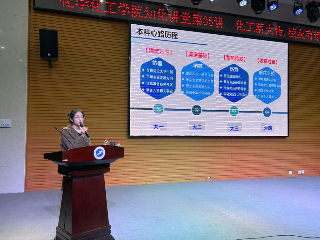 為更好的幫助學生提升專業學習能力,引導學生做好學業規劃,11月15日下午,化學化工學院在鄠邑校區經管人文樓118室舉辦“化工薪火傳,校友有話說”知化講堂第35講。本次講座特別邀請2016級優秀畢業生丁蕊同學擔任主講,學院200余名本科生及2023級全體研究生參會?;顒佑?023級研究生輔導員王蓉主持。
