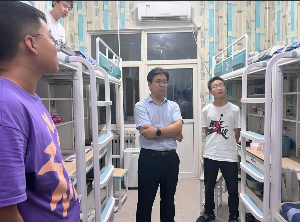 9月6日,在新生入校報到當晚,學院黨委書記宋海洋、學生工作辦公室主任馬武軍、2023級輔導員盧筱佳深入新生宿舍,詳細了解新生的住宿和生活情況。在走訪過程中,宋海洋與新生進行親切交談,從住宿飲食、生活習慣、發展規劃等多方面深入了解學生情況,詢問同學們的報到流程是否順利,關心同學們的入住體驗,并進行現場溝通解決,幫助同學們盡快適應新生活。宋海洋叮囑新生與同學之間要相互關心,相互幫助,盡快調整好狀態、適應大學新環境,以良好的狀態迎接大學生活。