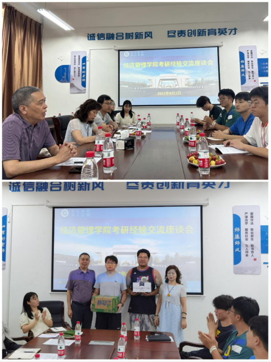隨后,老師們在崇文樓305會議室同暑期留校考研學生座談。座談會上,經濟管理學院黨委書記王宏衛向暑期留??佳袑W生表示慰問,他希望備考同學能樹立遠大目標,“志不立,天下無可成之事”,青年當用高遠之志照亮的燦爛人生,將科學備考與實現人生偉大抱負結合起來。要堅持“咬定青山不放松”的精神,迎難而上、扎實學習,注重積累、積極拓展知識面,保持熱情與動力,砥礪前行。他祝愿考研同學最終都能“春風得意馬蹄疾,一日看盡長安花”。院長王君萍為同學們介紹了學院考研的相關政策及激勵措施,她希望同學們要注重日常的積累,養成鉆研精神,著重梳理和總結往年的考研重點和規律。副院長李春霄從認真和堅持兩個方面出發,鼓勵2020級備考學生在備考過程中要堅持學習,只要認真、方法得當,就一定會有事半功倍的效果。2022級研究生杜澤萱和2023級研究生梁嘉樂從考研目標、考研規劃、時間管理等方面作了考研經驗分享。