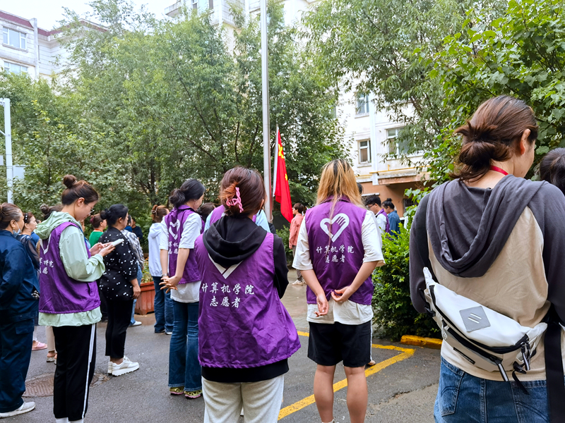 7月10日,社區組織升旗儀式,群眾自發的到達現場,狹小的廣場中擠滿了社區的男女老少。實踐團全體成員也參與其中,統一的紫色隊服和整潔的精神面貌為社區每周一的升旗活動增添了一道不一樣的風景。