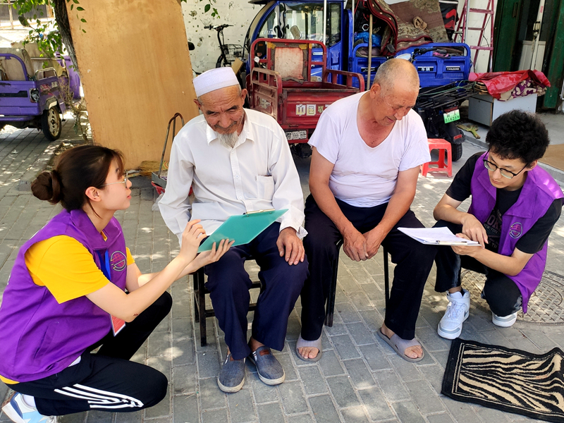這樣的感悟同樣來自參加了社區服務工作后的其他隊員。7月5日,團隊進行了為期一天的社區服務活動,在紅廟子片區福地社區的整理文件、接聽電話、門崗值班等工作,讓隊員們對新疆發展的認知又有新的理解。