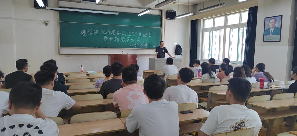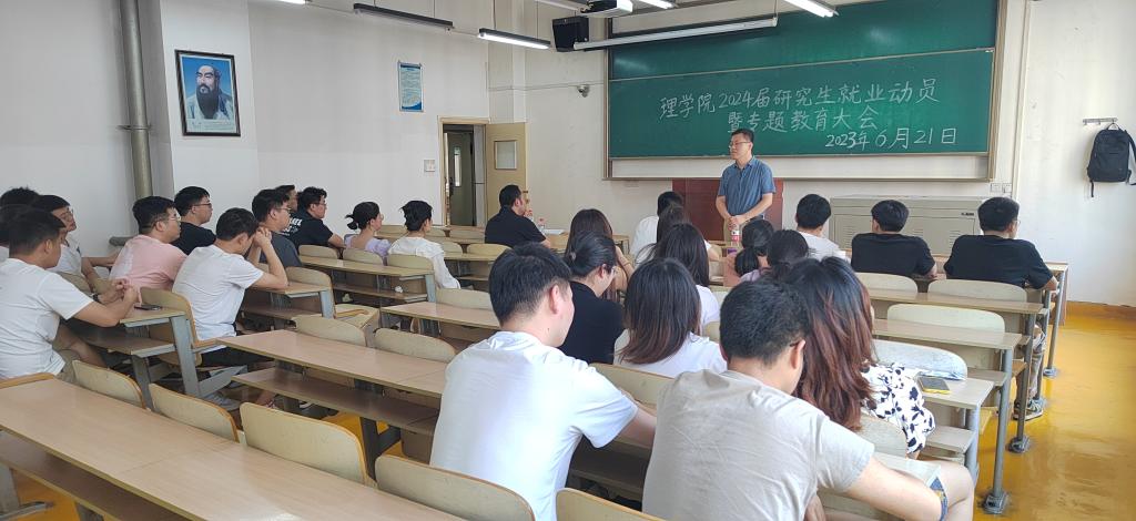 6月21日下午,理學院在雁塔校區東方石油樓1004教室舉辦了2024屆研究生就業動員暨專題教育大會。副院長折延宏主持,黨委副書記馬小剛主講,研究生輔導員龐波和2024屆40余名研究生同學參加。