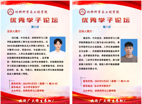 5月8日晚,材料科學與工程學院在鄠邑校區弘石報告廳舉辦優秀學子論壇第七講、第八講,本期邀請到的優秀學子是我院金材1902班劉文麗,已被東北大學錄取攻讀研究生;焊接1901陳世華,已簽約中海油能源發展股份有限公司。300余名本科生參加論壇。