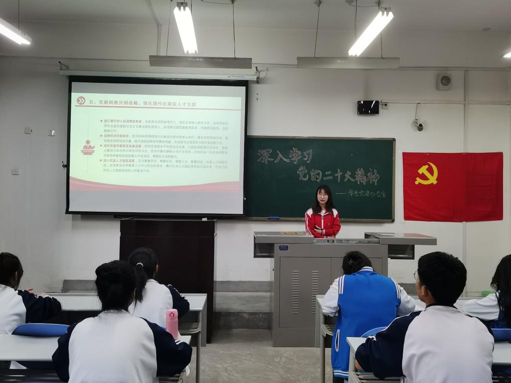 宣講活動由學生黨建辦紀檢部負責人汪旭蕾同學擔任主講,黨建辦全體學生干部參加。汪旭蕾同學圍繞黨的歷史、形勢政策、時事熱點等內容展開宣講,以互動問答的方式帶領同學們深入學習黨的二十大報告中的新觀點、新論斷、新思想,深刻領會黨的二十大主題和二十大報告主要內容,她帶領同學們共同學習了關于過去5年的工作和新時代10年的偉大變革,關于馬克思主義中國化時代化,關于中國式現代化,關于全面建設社會主義現代化國家的目標任務和關于黨的全面領導和全面從嚴治黨五個部分的內容。汪旭蕾希望在場同學后續能繼續加強自身學習,強化自身專業能力,做到學以致用,讓青春之花在不懈奮斗中絢麗綻放。
