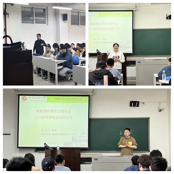 為進一步加強學院學風建設,夯實“三全育人”工作理念,建立“系+學工”協同育人機制,構建“黨建+學風”協同育人模式,幫助2024屆畢業生提前明確未來發展方向,合理制定考研目標,樹立正確的就業觀念,切實激發起學生學習的內在動力,營造出良好的學習氛圍,根據新能源學院黨委安排,4月10日-14日期間,學院各專業“師生黨支部結對共建活動暨2024屆考研就業師生座談會”在鄠邑校區相繼召開。