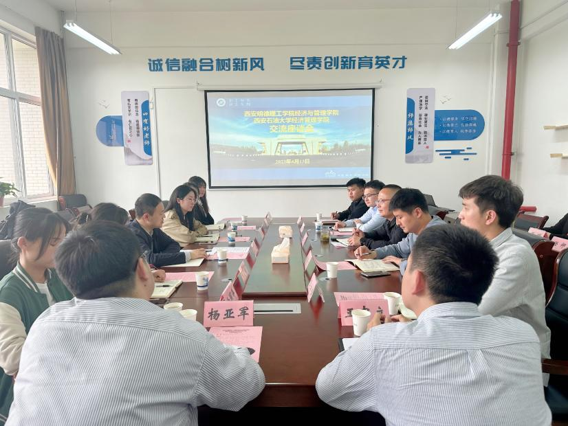 王剛代表學院向西安明德理工學院經濟與管理學院來訪表示熱烈歡迎,并詳細介紹了西安石油大學經濟管理學院的發展歷史、基本情況及學生管理工作等情況。李博文介紹了學院學生黨建工作辦公室的設置及基本情況,王業林介紹了學生支部的工作開展情況,史陽介紹了學生學科競賽組織及開展情況,研究生姬祥飛介紹管科系學生黨支部樣板支部建設情況。