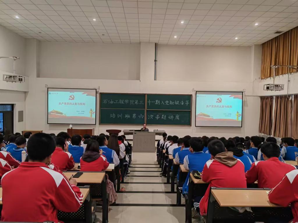 為規范黨員發展流程,加強對入黨積極分子的教育培訓,進一步提高黨性修養和理想信念,石油工程學院于4月13日晚在開物樓115教室成功舉辦第三十一期入黨積極分子培訓班第六講。本次授課線上線下同步進行,我校黨委宣傳部常務副部長趙承勝受邀擔任主講,授課主題為“黨員的義務和權利”。