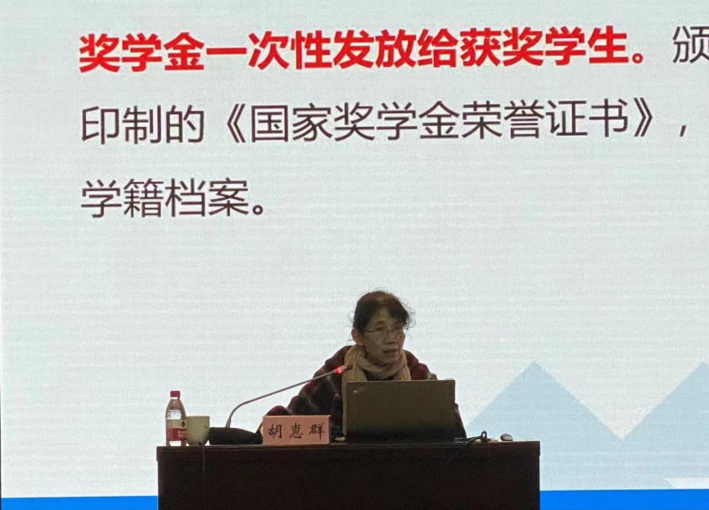 胡惠群從國家獎學金、國家勵志獎學金、國家助學金、家庭經濟困難學生認定、資助與育人五個方面展開培訓,詳細介紹了國家和陜西省相關資助政策,解讀了各類獎助學金的申請、評審、發放等重點工作環節。她強調,要將資助與育人相結合,堅持為黨育人,為國育才。要全面貫徹黨的教育方針,落實立德樹人的根本任務,注重“扶貧與扶志、扶智相結合”,引導困難學生自立自強、全面發展、成長成才。與此同時,她還鼓勵我校學工干部創新育人形式,建設和諧溫暖資助氛圍,為國家培養更多的建設人才。